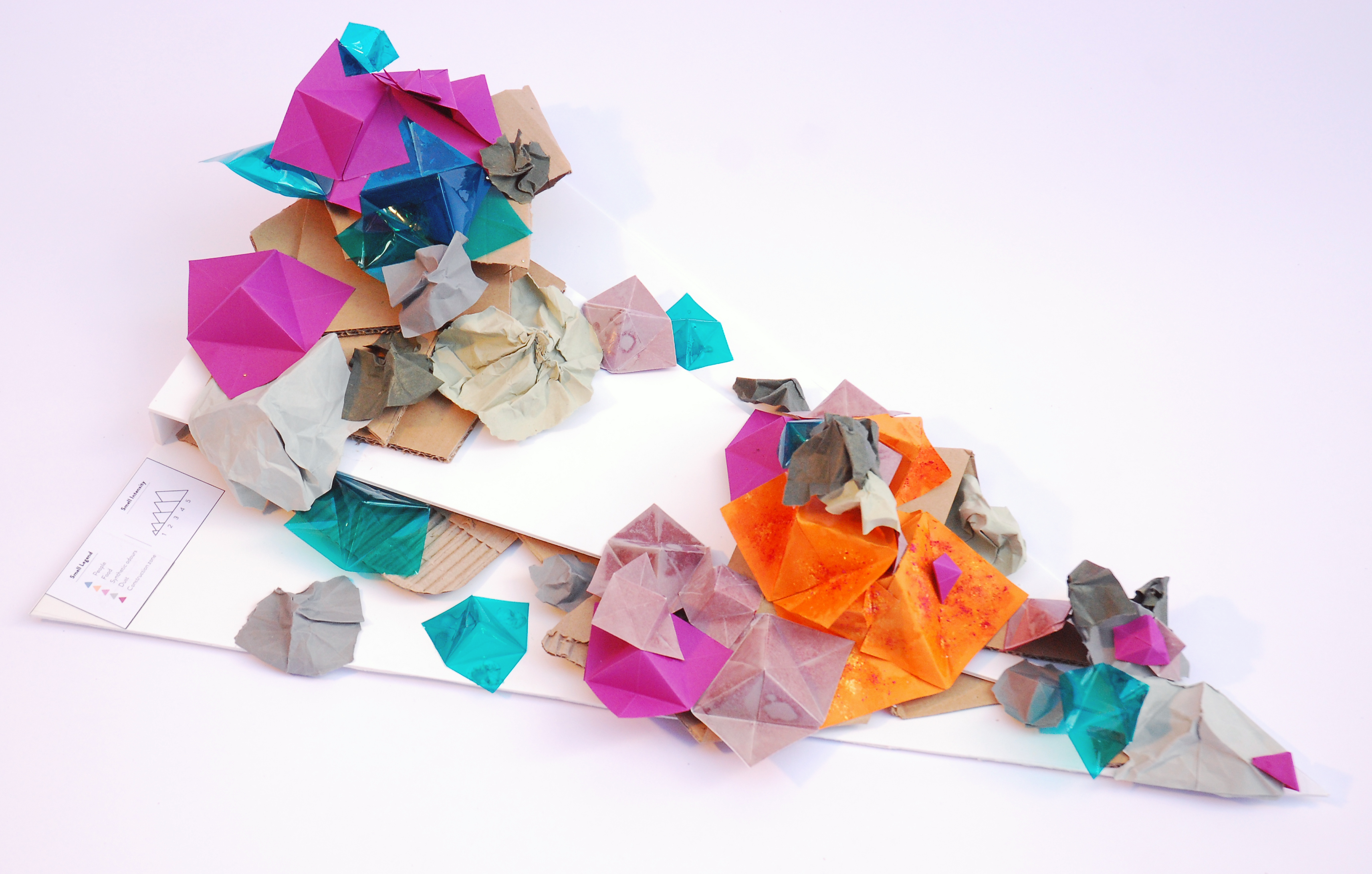 • L'odeur des différentes poussières est représentée par du papier froissé, qui rappel le côté déchet, usé, de cette odeur, la couleur de ces papiers suit un camaïeu de gris.