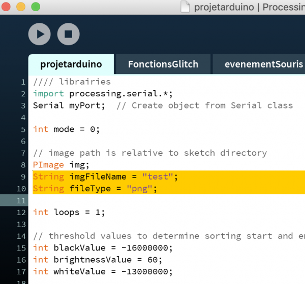 Décompresser le dossier ASDFPixelSort.zip Ouvrir le fichier ASDFPixelSort.pde Choisir l'image voulue, la glisser dans le dossier ASDFPixelSort( attention le programme est assez long pour des raisons pratiques je recommande de l'organiser) De retour dans ASDFPixelSort.pde, Pour indiquer au programme quelle image doit être utilisée, insérer le nom de l'image (ici test) entre les guillemets dans la ligne StringimgFileName = Indiquer l'extension (ici jpg) de l'image choisie entre les guillemets, dans la ligne suivante