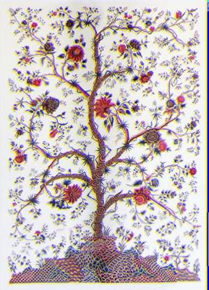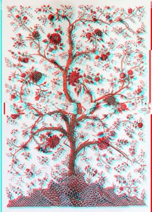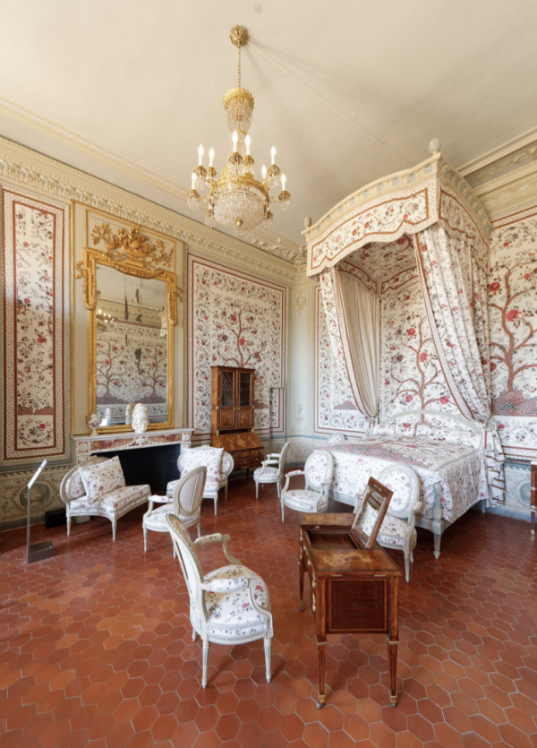 Située sur la façade nord, cette chambre offre des motifs floraux et notamment celui de l’arbre de vie: un arbre avec des branches tordues et fleuries émergeant d'un petit monticule et encadré de deux bordures, une grande et une petite, également fleuries. Cette chambre rassemble le mobilier le plus précieux du château et possède de nombreux textiles pour décliner ce motifs. Le motif va ainsi apparaître autant sur les murs de cet appartement que sur les rideaux, les sièges, les canapés ,fauteuils et coussins de celui-ci. Ainsi, pour permettre cette déclinaison, une grande richesse et diversité techniques a été mise en oeuvre: la broderie, le tissage et l’indienne, c’est à dire du tissus peint . Et c’est en effectuant mes recherches sur ces motifs et notamment sur les techniques de création de ces motifs que je me suis rendue compte que l’ensemble du travail des textiles de cette pièce n’était pas d’origine.