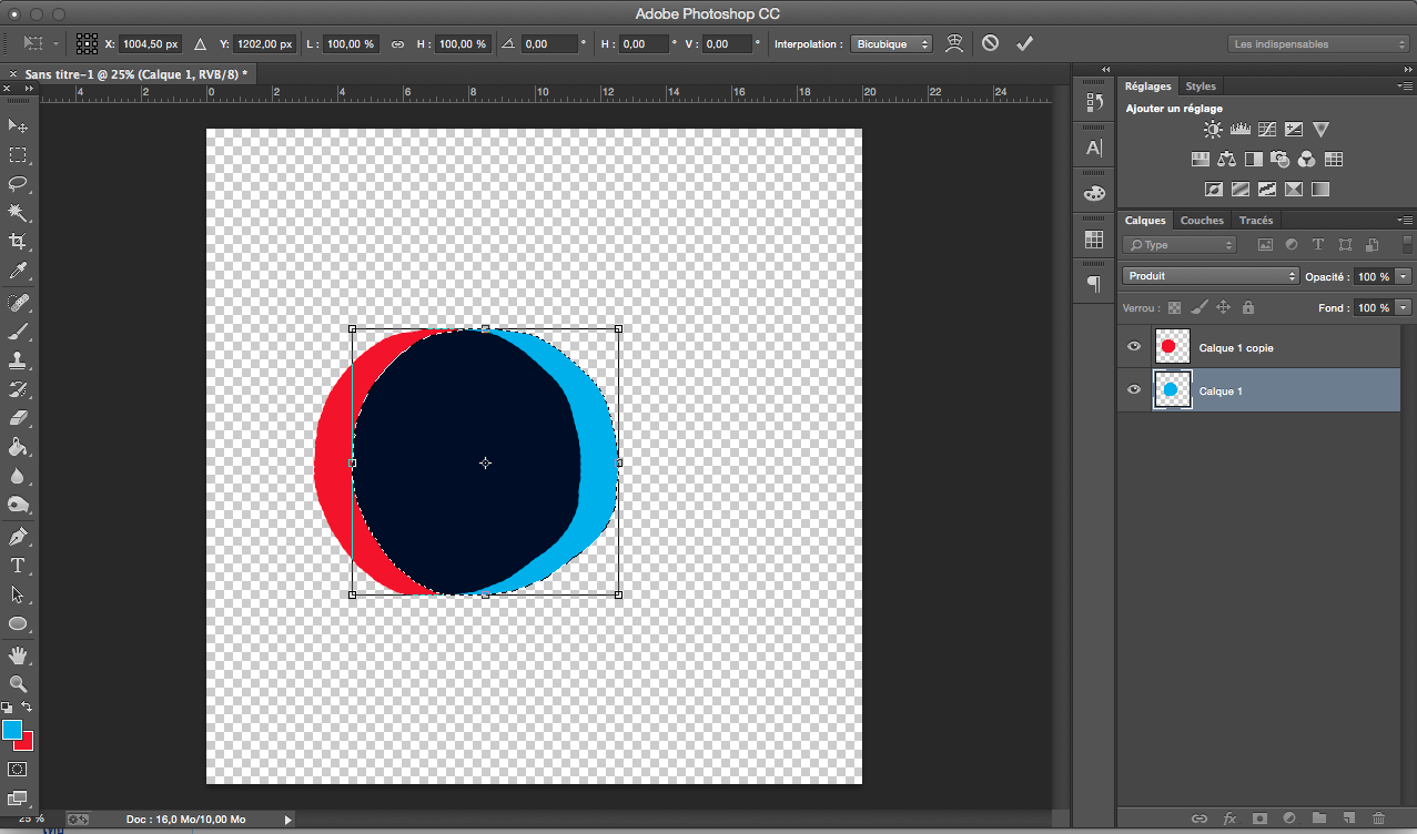 Avec cmd+T, déplacer le calque cyan par exemple vers la gauche ou la droite de l’objet rouge suivant l’effet choisi (gauche=en arrière/droite= en avant)