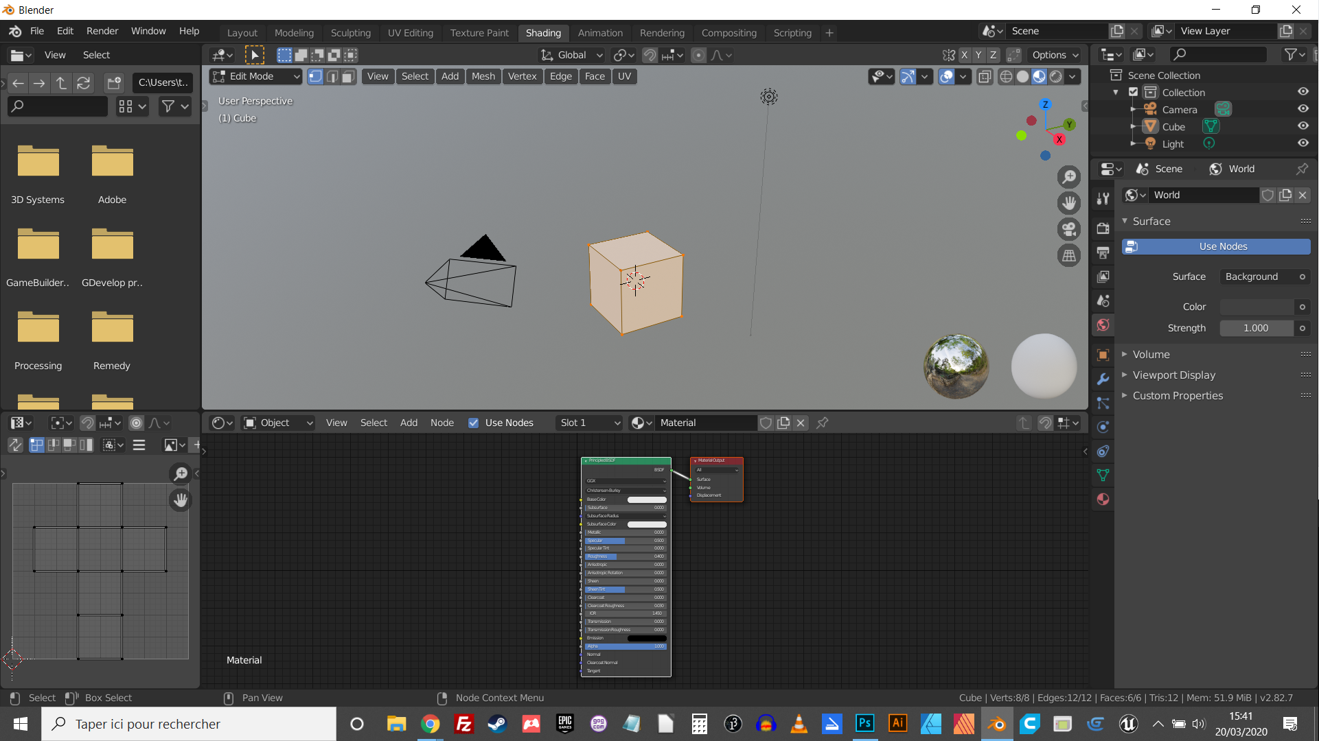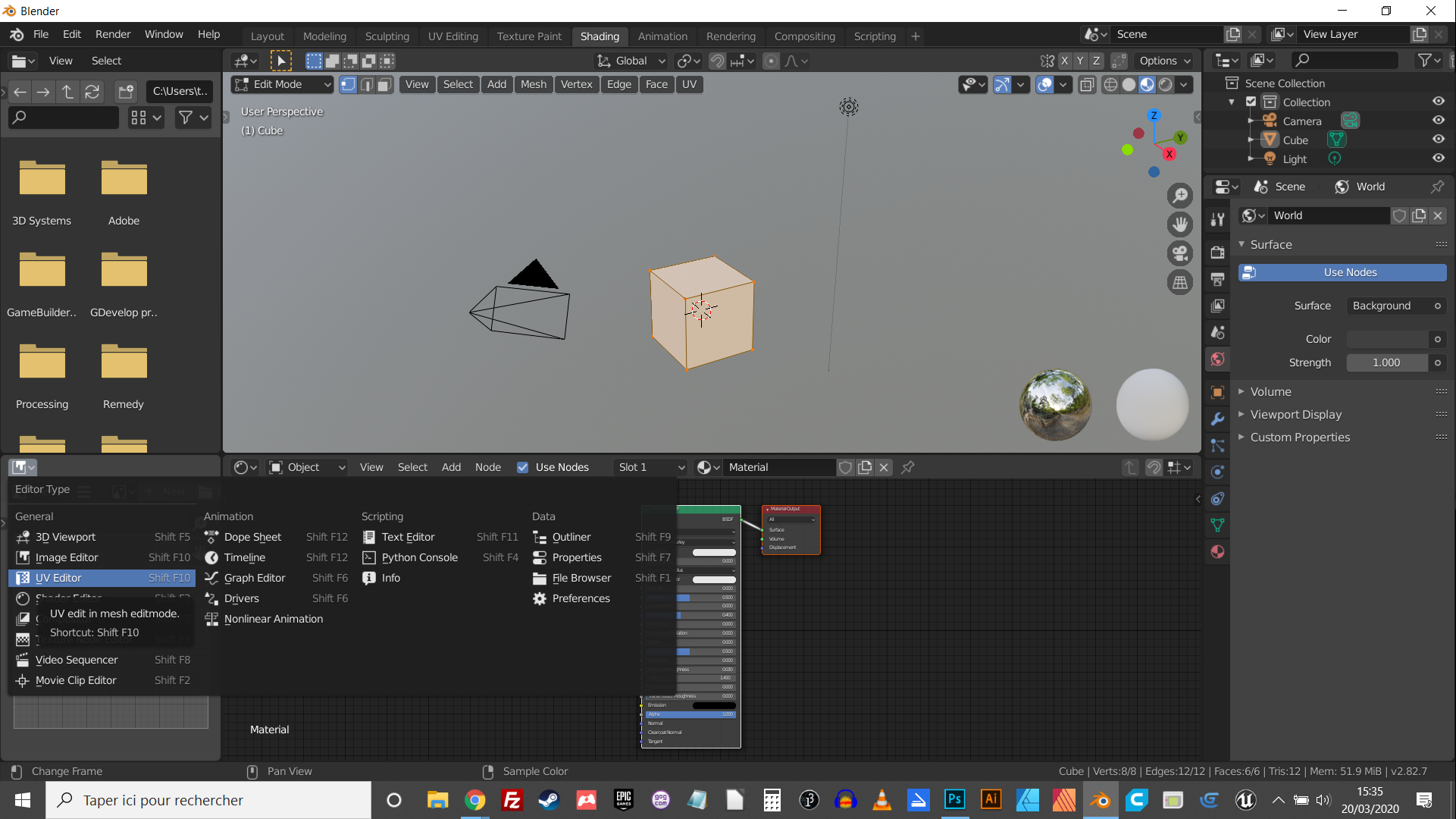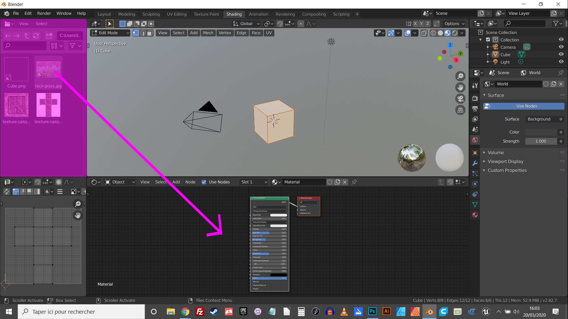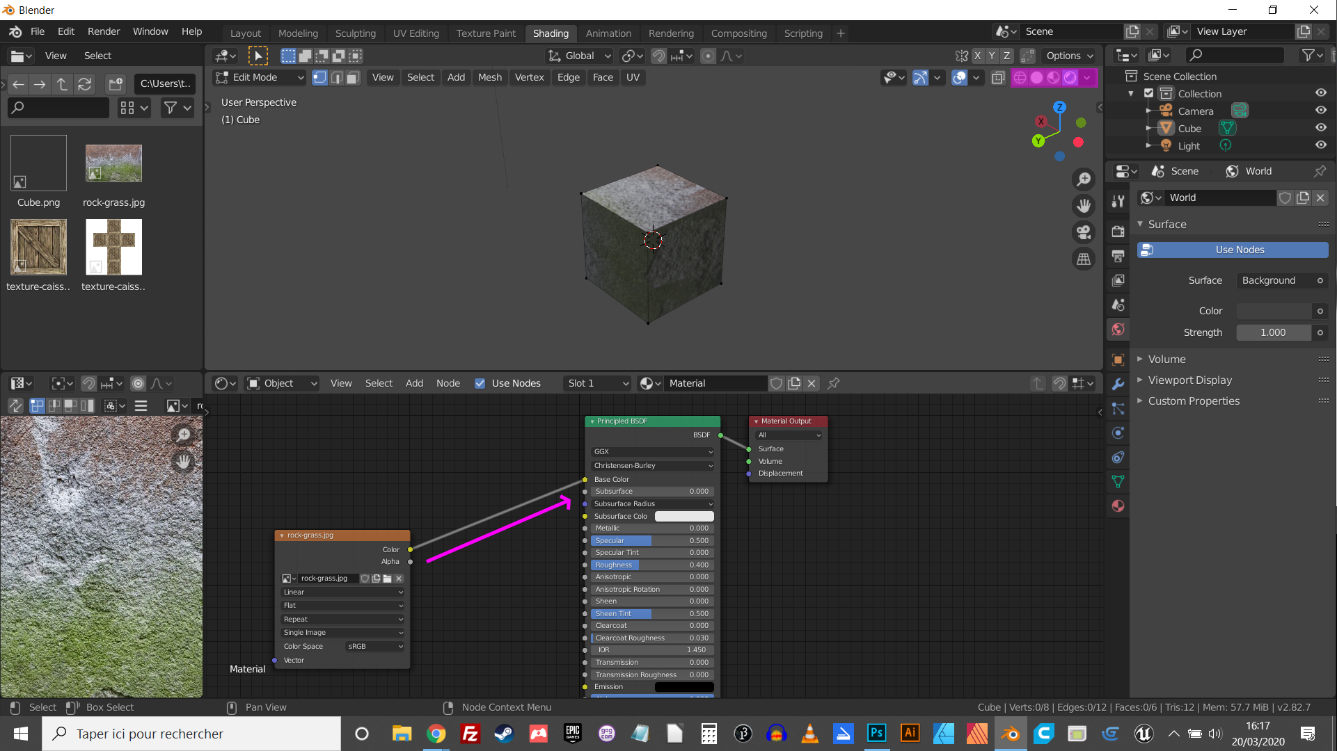 Pour cet exercice il s'agit d'utiliser le système “d'UV mapping”. U et V correspondant aux 2 dimensions de l'image qui sera appliquée comme texture sur l'objet 3D, soit X, Y et Z. On parle de “dépliage UV” ou “unwrapping”.