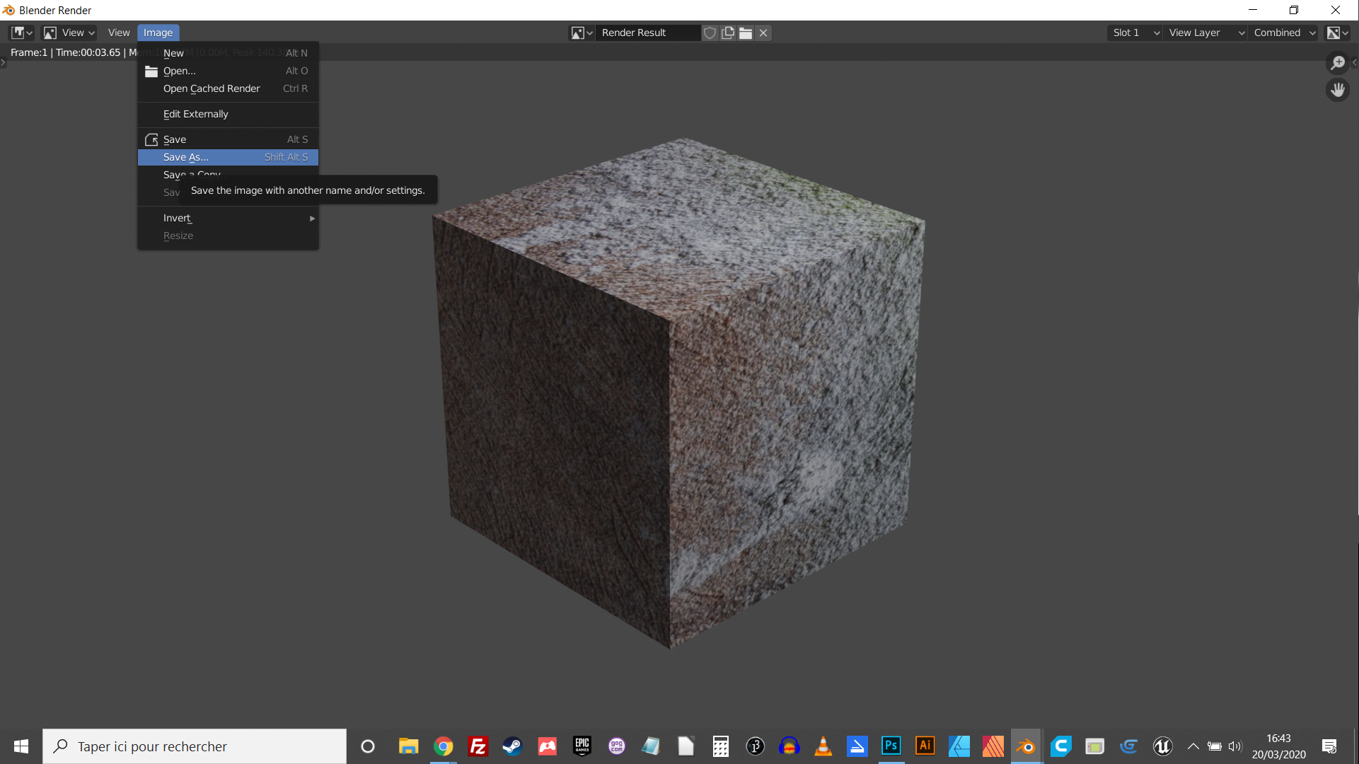 Pour calculer le rendu, simplement sélectionner dans la top bar: Render > Render Image