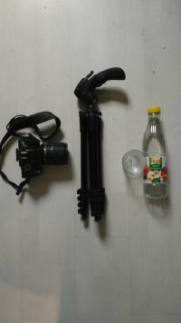 Donc si vous voulez refaire la même vidéo il vous faudra vous munir absolument d'un appareil photo ou d'une caméra, d'un trépied, d'un verre vide et d'une bouteille de jus de pomme Vitafit remplis d'eau.