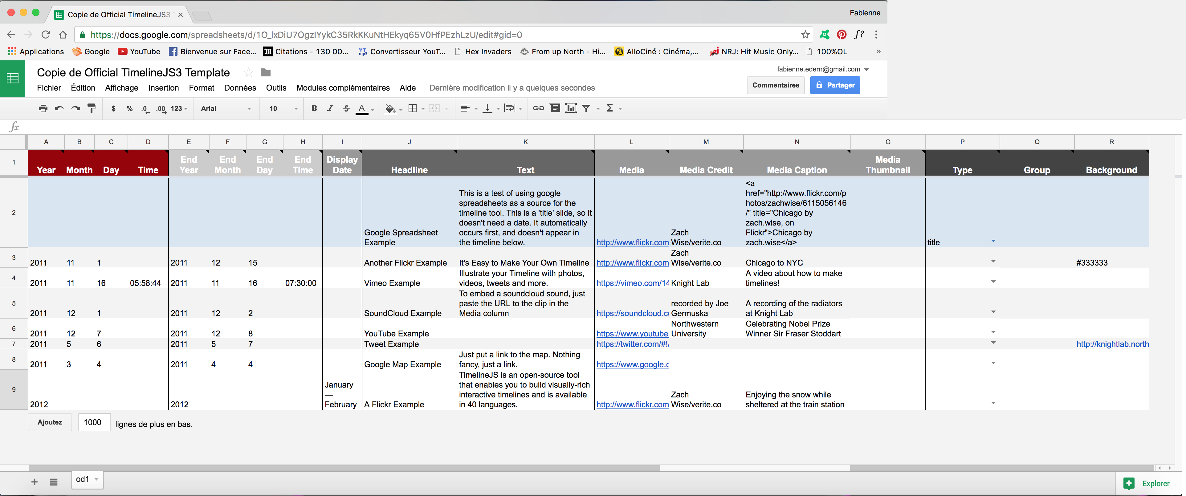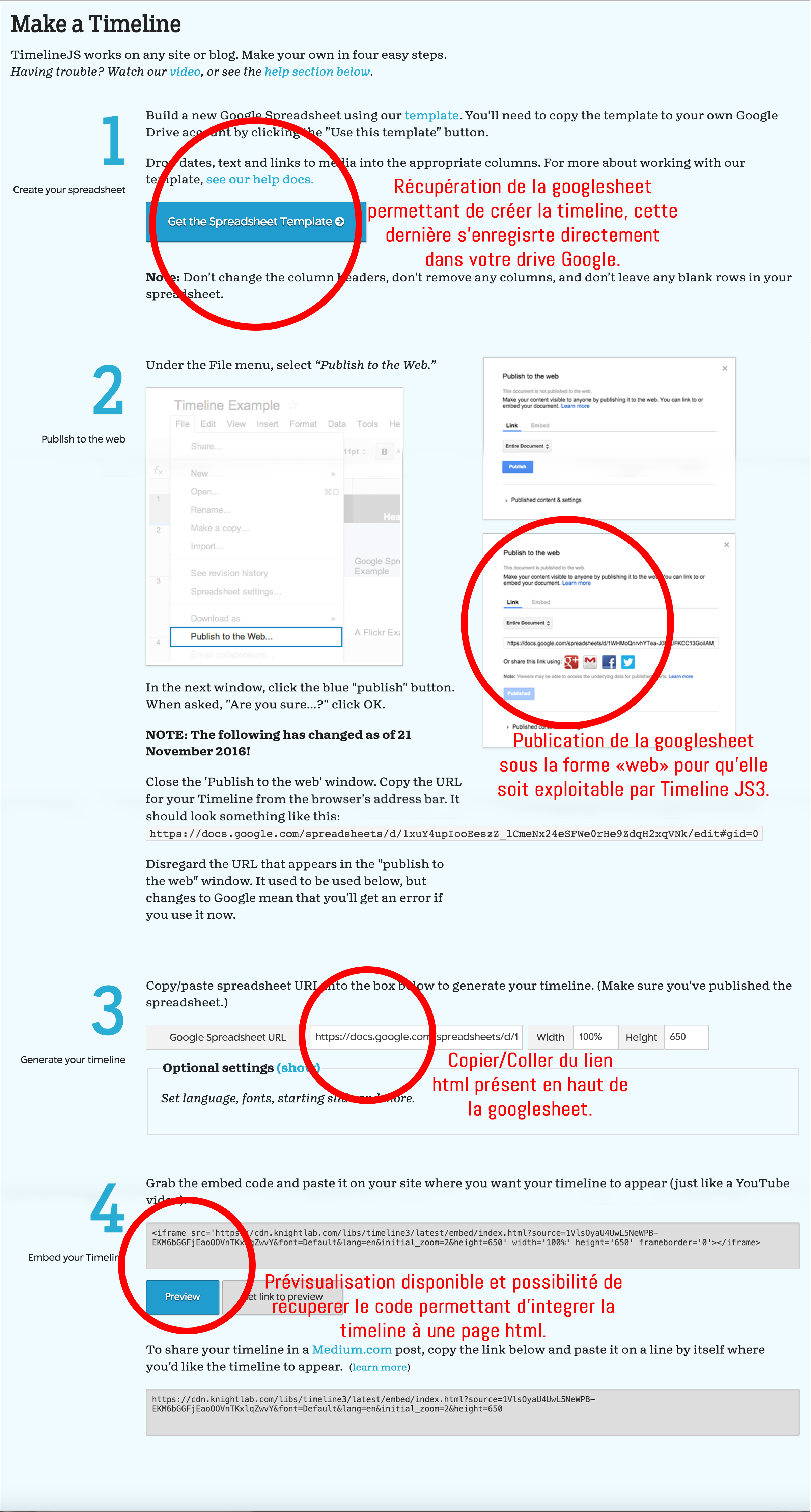 TimelineJS propose un pas à pas en anglais pour faciliter la prise en main de l'utilisateur, en voici un décryptage rapide :