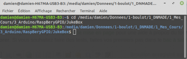 Pour lancer le programme, il faut ouvrir un terminal et se placer dans le dossier contenant le programme “Jukebox4.py” :