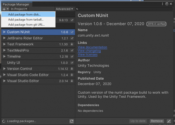Importer le package depuis Unity’s menu Windows → Package Manager → Add package from disk