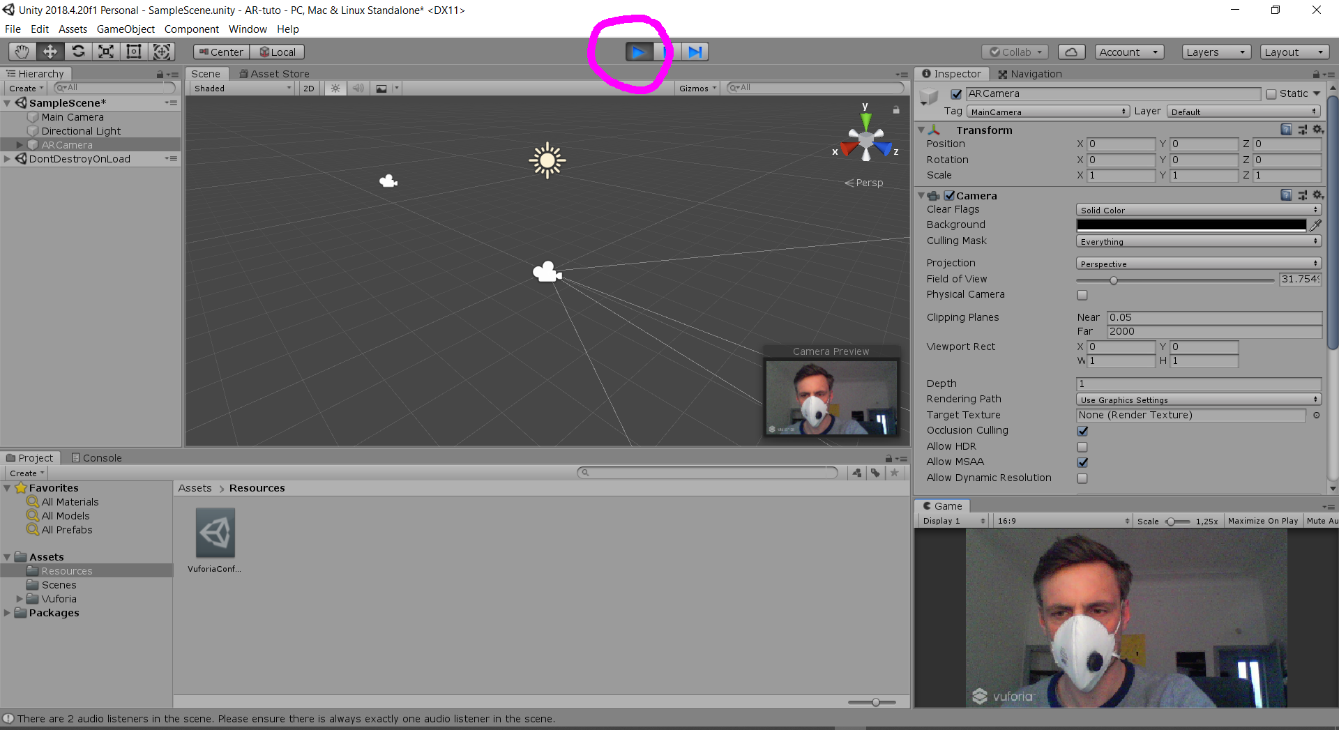 Création d'une caméra AR (désactiver ou détruire Main Camera).