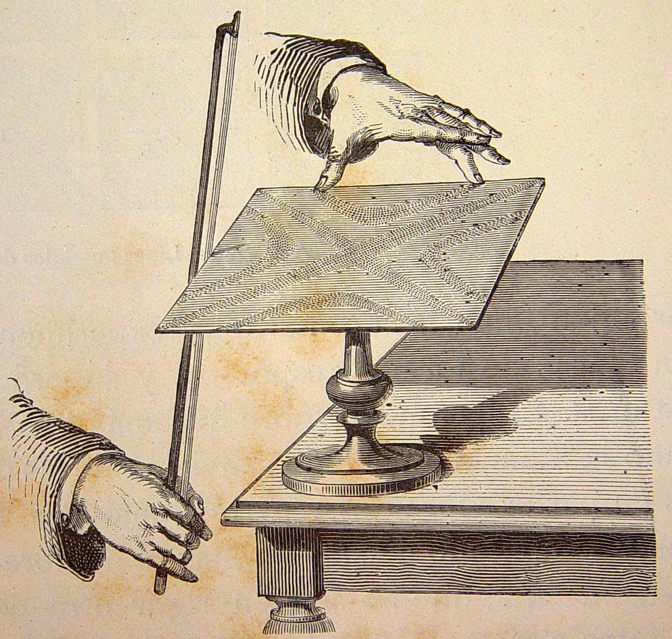 Au tout début du dix-neuvième siècle, Ernst Florens Friedrich Chladni était célèbre pour donner des représentations de cette expérience. Prenant une plaque de cuivre, il l’a saupoudrait de sable fin, puis l’a faisait vibrer en y frottant un archet. Il transformait ainsi la plaque en instrument de musique. Le sable dessinait alors des figures géométriques qui dépendaient des vibrations imposées à la plaque. Chladni est un des pères fondateurs de l’acoustique moderne et les figures qui portent son nom se rapportent, sans surprise, à ce domaine des sciences : les lignes dessinées sur la plaque de cuivre sont intimement reliées au son que celles-ci produisent quand l’expérimentateur les fait vibrer. Ainsi, les figures de Chladni permettent de voir un son. Sous l’excitation de l’archet, la plaque vibre, le sable se déplace depuis les zones de fortes vibrations vers les zones où la vibration est moins forte voir nulle (nœuds de vibration de l’onde stationnaire). La modification de la position du point d’excitation fait apparaître des figures différentes qui correspondent aux différents modes vibratoires de cette plaque. Suite à ça je voudrais vous parler d’une autre personne qui c’est inspirée du travaille de Chladni mais pour représenter ces figures dans un état liquide et non plus par le résultat d’une friction entre l’archet d’un violon d’une plaque de cuivre/métal et du sable/sel.
