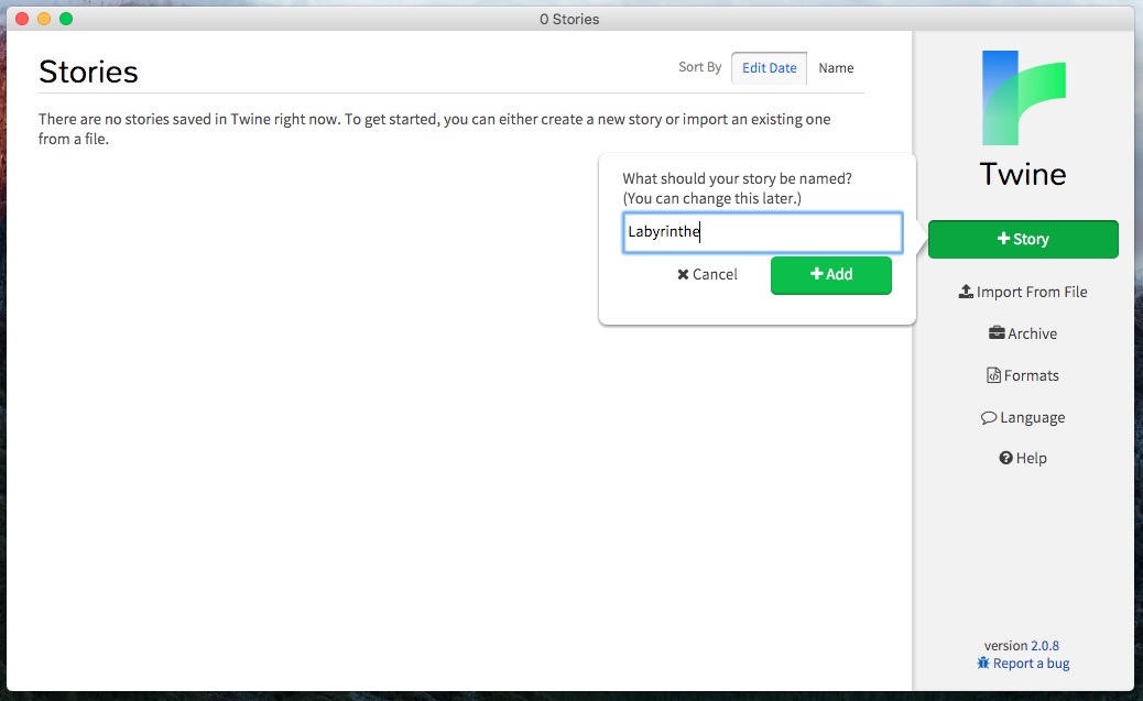 Twine est disponible sur Windows et Mac OS X, mais on peut également l'utiliser en ligne. Installez le logiciel Twine depuis le site officiel.