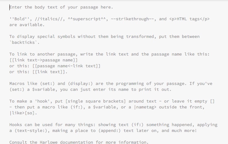 Aucune programmation n’est nécessaire pour créer une histoire simple, mais il est possible d’étendre les possibilités en utilisant des variables ou des conditions par exemple, et de personnaliser le code HTML, CSS et Javascript.
