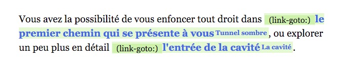 Il est maintenant temps de créer les étapes suivantes de notre histoire : il est nécessaire d'indiquer les extraits textuels qui porteront les liens qui permettront de choisir la suite de la narration. Pour cela, il faut utiliser les crochets de cette façon :