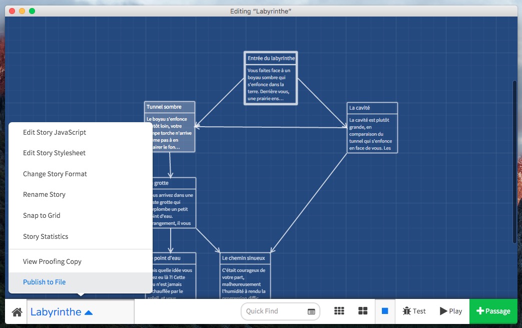 La démarche est des plus simples : dans le menu déroulant accessible depuis le nom de votre histoire, sélectionnez “Publish to file”.