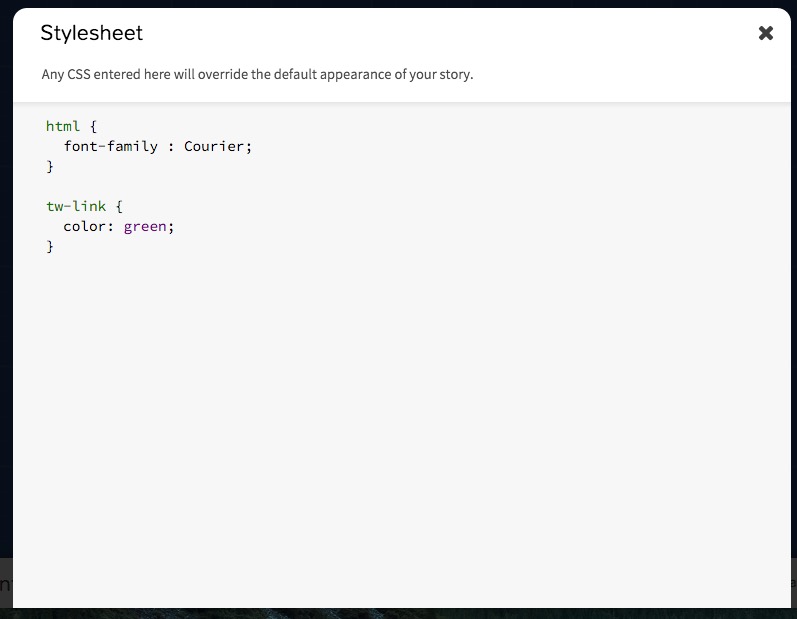 Twine mentionne alors que tout les choix CSS inscrits dans cette fenêtre seront prioritaires sur le style par défaut fourni par le logiciel. Afin d'illustrer ces possibilités, nous allons modifier la couleur des liens (initialement en bleu) ainsi que la police d'écriture. L'ensemble des noms des éléments modifiables sont à retrouver sur ce tutoriel consacré au CSS sur Twine.
