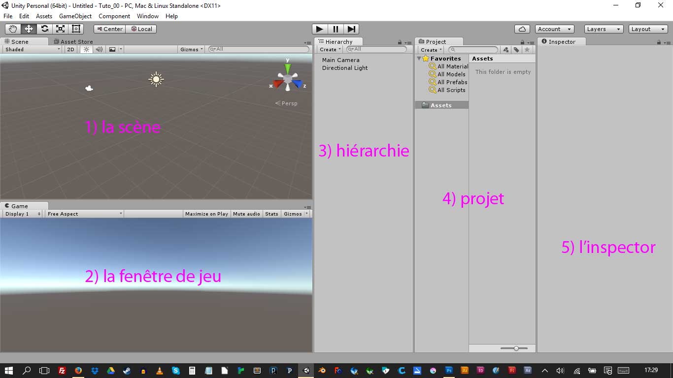 La fenêtre Inspector présente toutes les informations concernant un objet sélectionné, position,rotation, taille etc.