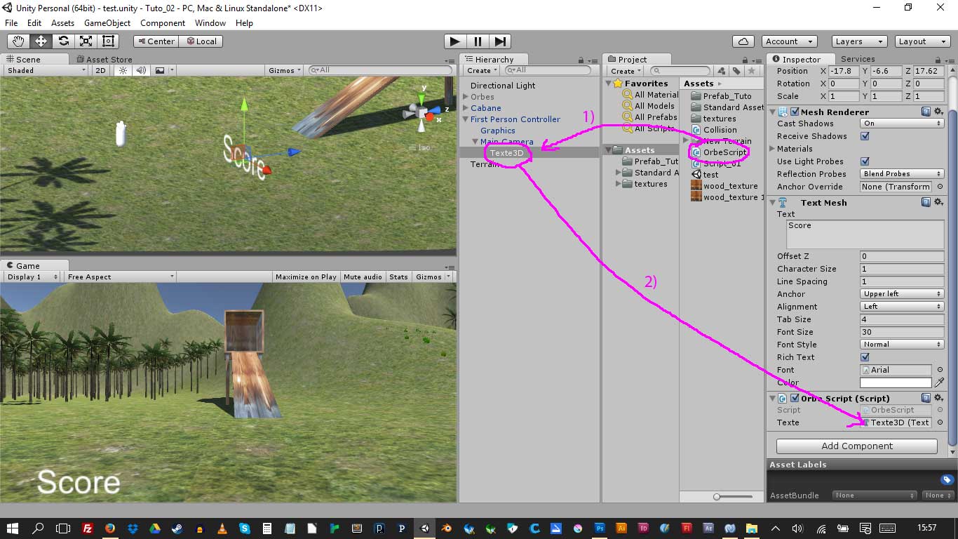 L'objet 3D Text s'affiche à l'écran, renommez-le (F2 ou Inspector) “Score” par exemple. Glissez-le dans la Main Camera de l'objet First Person Controller afin qu'il soit “enfant” de celle-ci. Modifiez sa position dans la fenêtre preview et modifiez ses attributs dans l'Inspector.