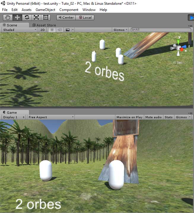 Placez plusieurs Orbes sur le terrain en glissant votre Prefab Orbe directement sur la Scène. Testez le jeu,à mesure que vous entrez en collision avec les Orbes, le score s'incrémente.
