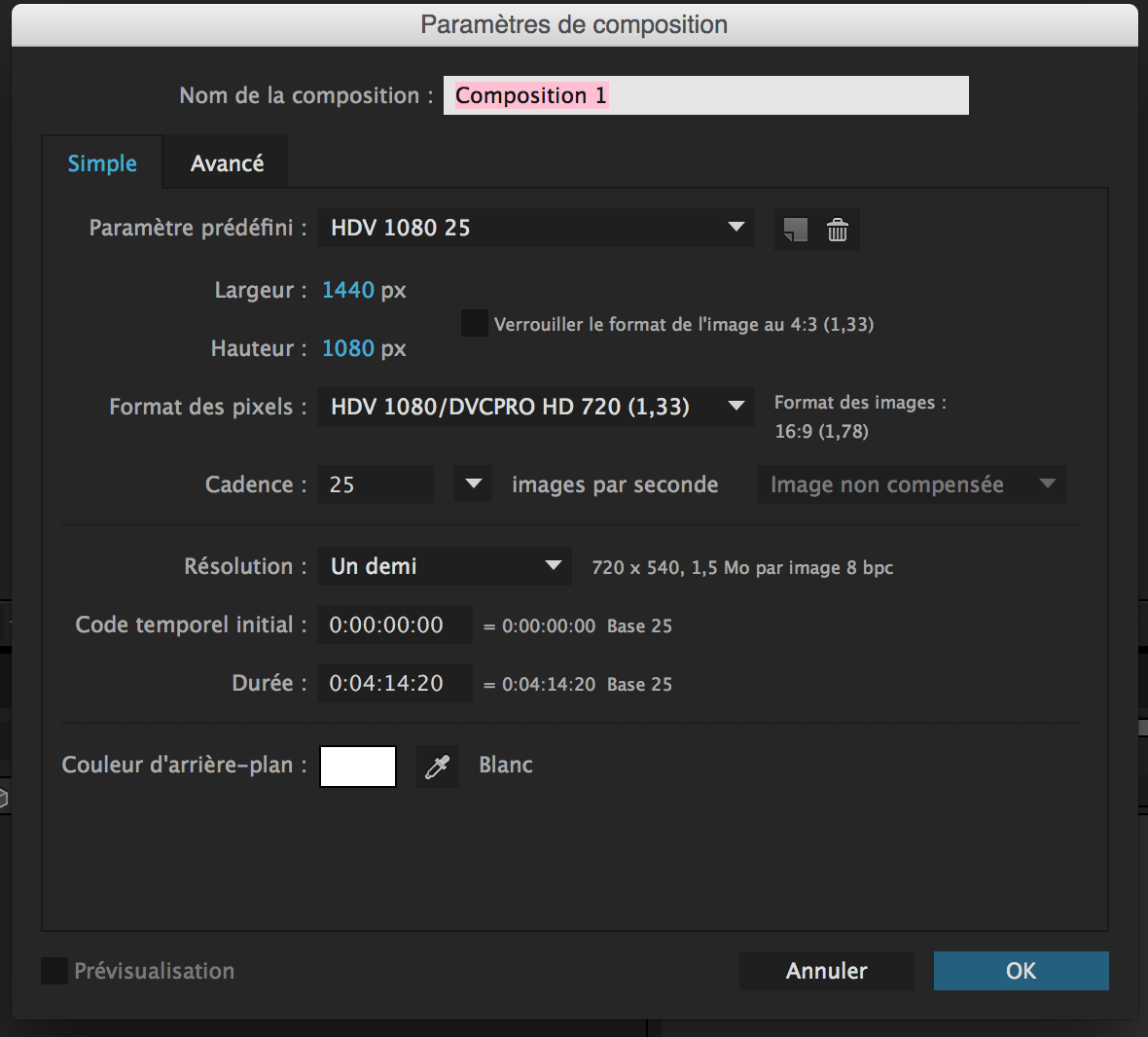 Pour commencer, créez une nouvelle composition en appuyant sur la combinaison de touches Ctrl + N ou Composition-Nouvelle composition ( il est souhaitable de sélectionner la résolution de la composition est la même que celle de la vidéo éditée ) . Vous pouvez changer la durée selon votre besoin.