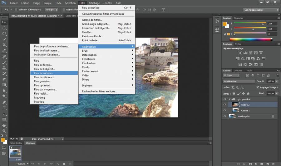8 Puis de nouveau, retourner sur le calque 2. Aller dans FILTRE - ATTÉNUATION - FLOU DE SURFACE