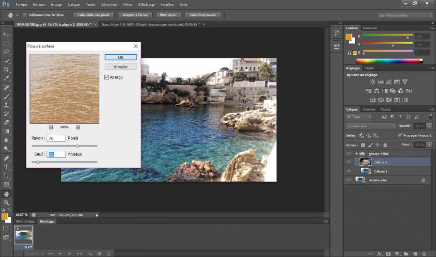 9 Garder ou modifier les paramètres du flou de surface (mes paramètres : rayon -70 px et le seuil 25 ) et cliquer sur OK