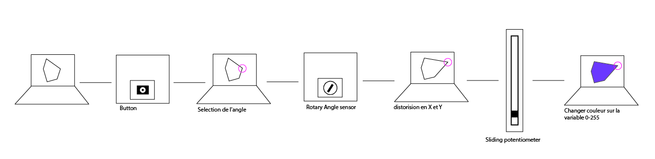 Pour que vienne la phase suivante, celle de la restitution. Une possibilité de reproduire l'objet visuel sur Processing avec 8 potentiomètres (6 pour la distorsion des angles et deux autres pour la couleur et la rotation) La question reste de savoir si le cobaye essayera de reproduire la forme induite précédemment ou s'il s'en détachera venant crée un objet inédit.