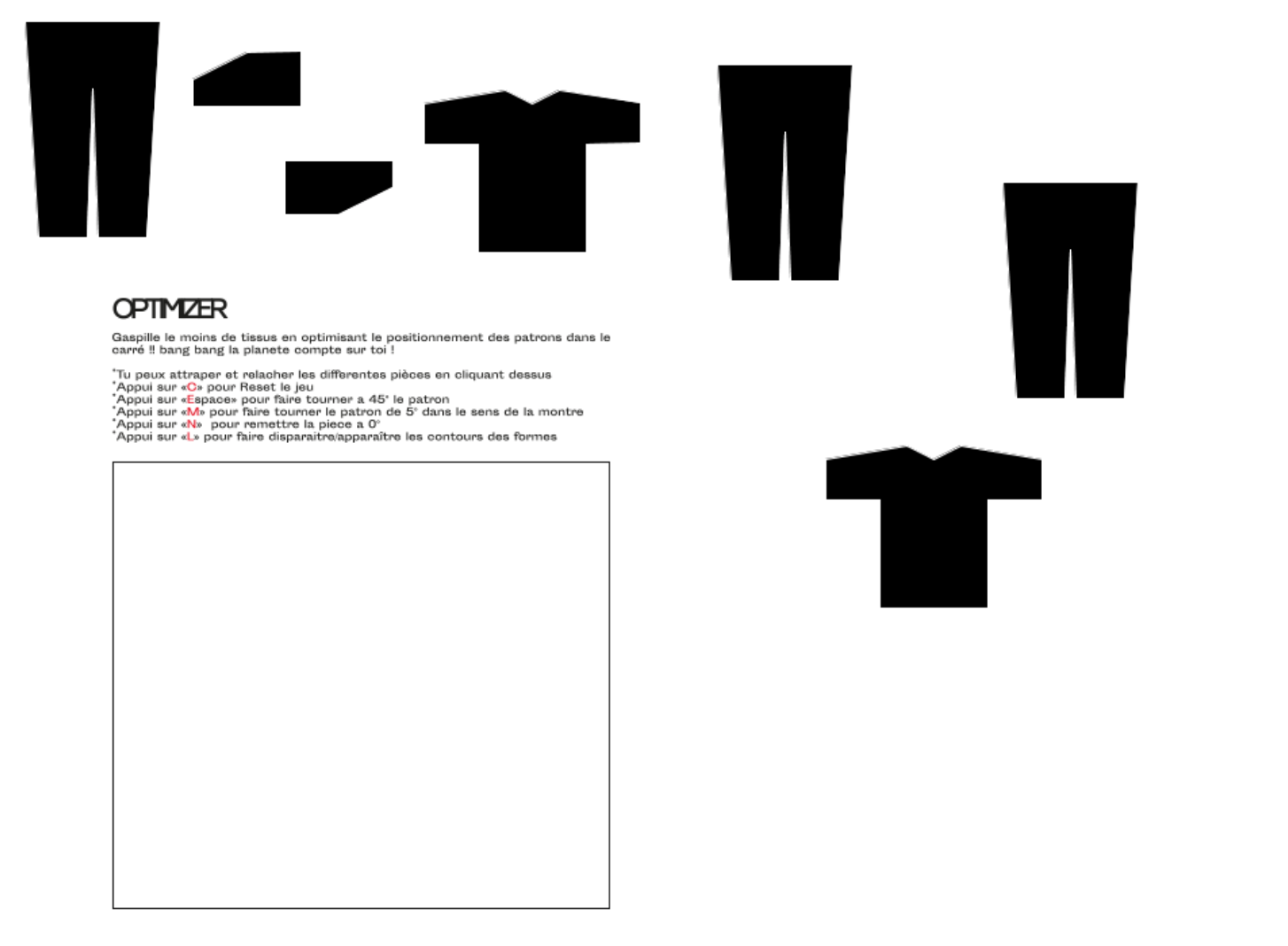 Cette outils m'a permis de programmer une premiere ébauche de ce dispositif de mediation que j'ai baptisé OPTIMIZER le fonctionnement est simple, on dispose de plusieurs patron de vêtements qu'il faut arriver à disposer de façon la plus optimal dans le carré. L'utilisateur dispose de plusieurs touche pour faire tourner le patron etc..