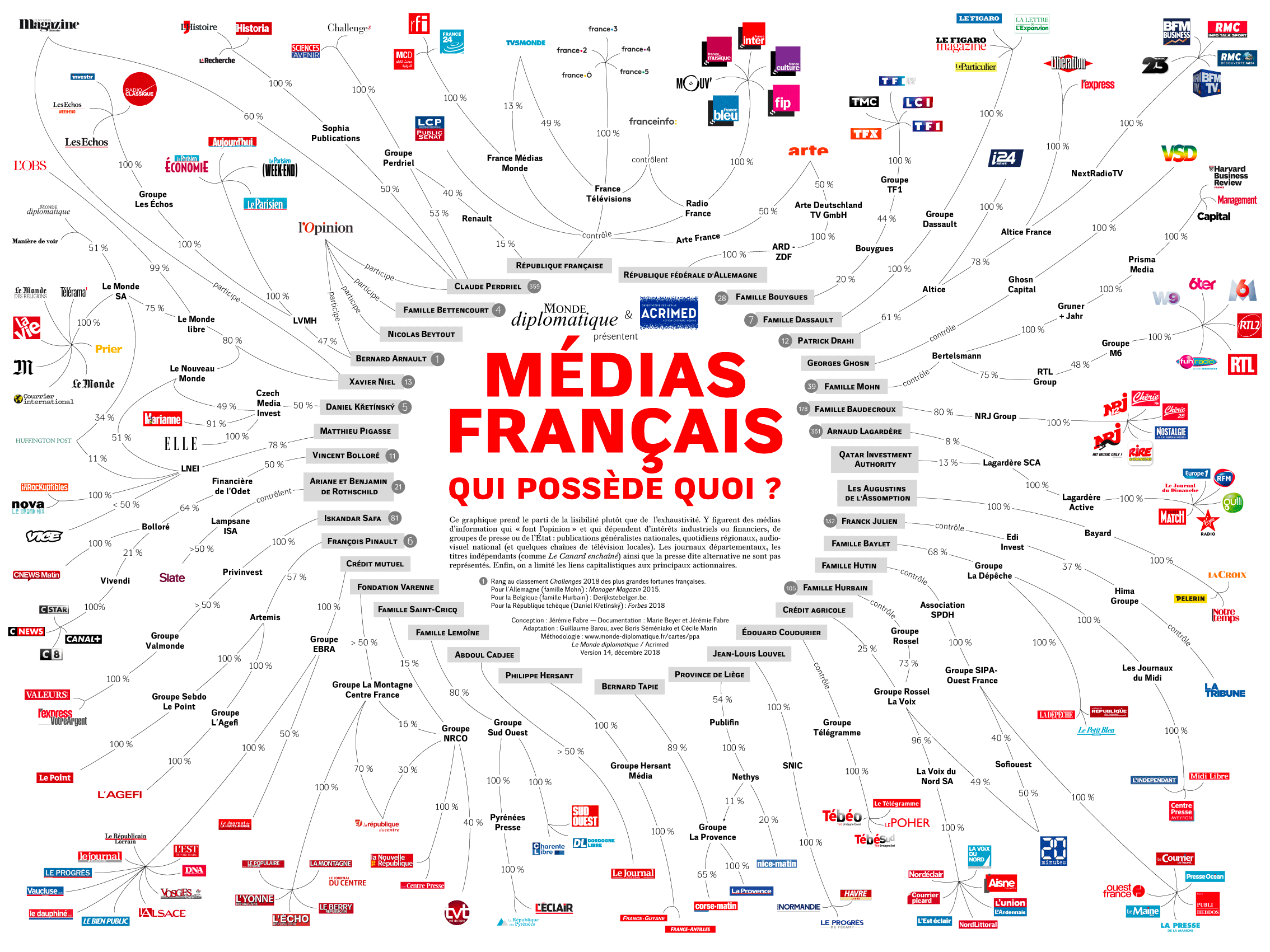 La quasi totalité des titres de la presse française appartient à de grands industriels tels que par exemple Barnard Arnault (l'homme le plus riche de France), il possède (par le groupe LVMH) les Échos, Le Parisien, Radio Classique. Ou encore Patrick Drahi (qui possède Altice le géant des télécommunications), a des actions chez Libération, L'Express, et BFM TV.