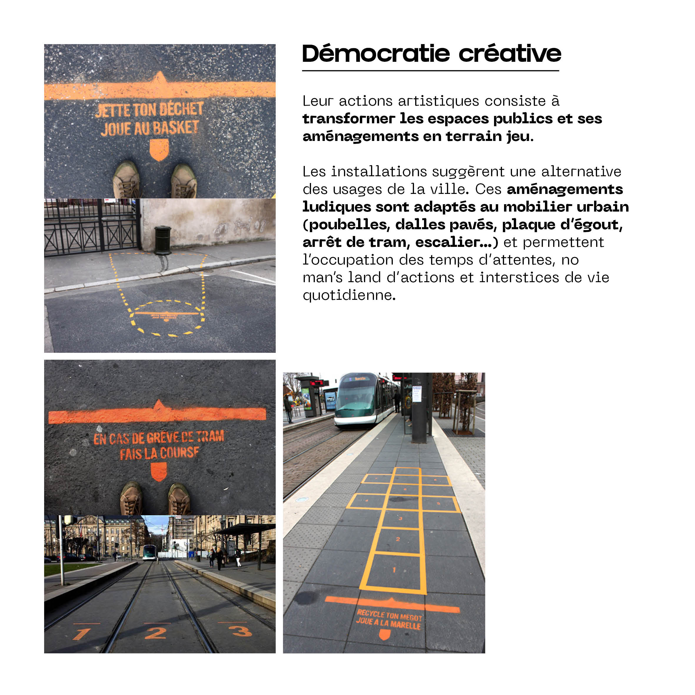 —→ Faire entrer des œuvres dans le quotidien d’une ville, des œuvres interactives qui lient les utilisateurs et les habitants de cette même ville. Quelque chose de pratique est d’habituelle. Placé dans des endroits stratégiques; Métro, arrêt de bus/tram, parcs… En ce qui concerne le graphisme, les images, les visuels et autres symboles de représentation peuvent montrer et imager de nombreuses significations. Le but étant de montrer comment des visuels peuvent être traduits de différentes manières en fonction du public et que plusieurs sens peuvent être traduits. Elle peut parfois être trompeuse (trompe l'oeil, impossible à saisir…) Tout mettre en oeuvre pour que de l’interaction se passe et qu’à terme une relation s’établisse entre les utilisateurs.