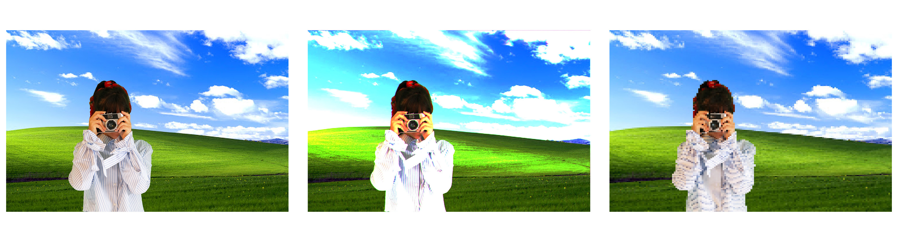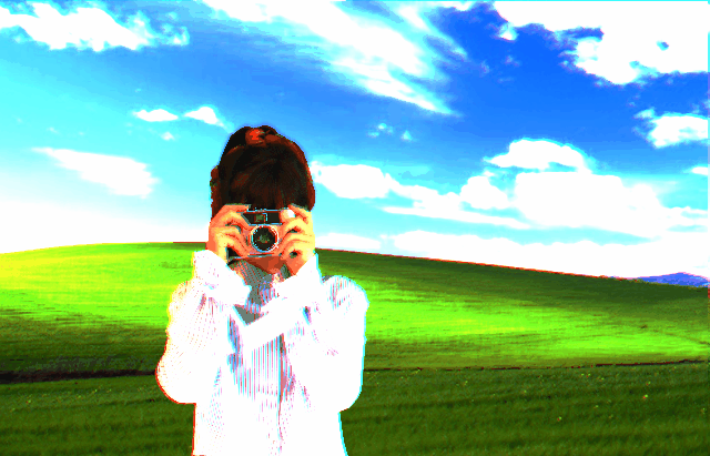 Reprenant mon contexte principal du cyber-voyageuse, je me mets dans la peau de ce dernier. Je me suis appropriée les fonds d’écrans windows, à caractère paradisiaque. Je pars en expédition numérique à travers les écrans. Cependant, comme dit dans mon mémoire de recherche, le voyage numérique et authentique sont complètement différents. Pour accentuer cet écart, j’ai utilisé plusieurs techniques de beug, une sorte d’altération au voyage fait numériquement. Un peu comme si je m’étais incrustée dans la matrix… lol