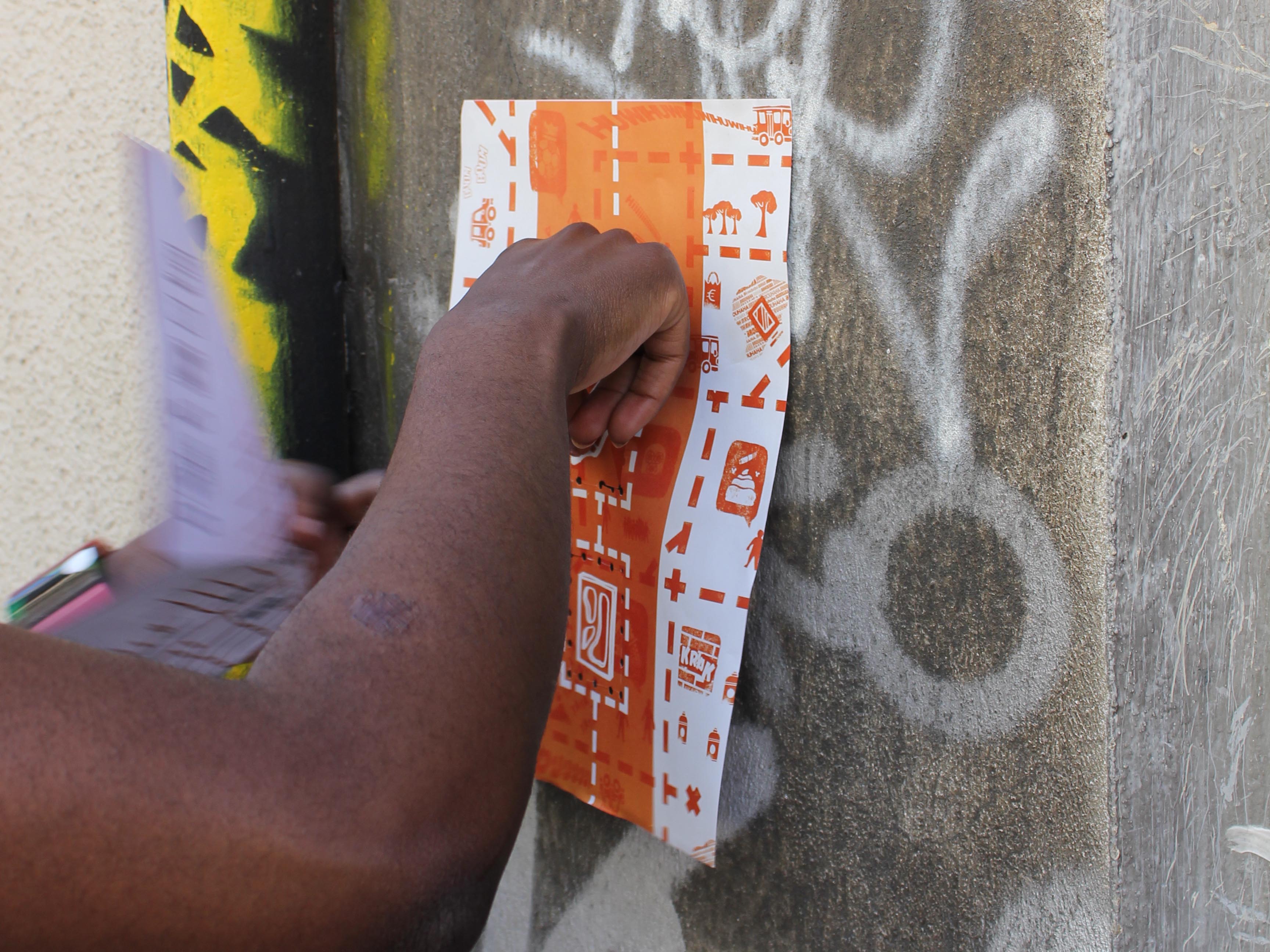 Dans sa dernière version, l’atelier se composait donc de deux parties. Dans un premier temps, les participants s’adonnent à un jeu de piste par équipe où le but est de trouver différentes balises dans un territoires donné à l’aide d’un plan. Chaque balise est une affiche contenant un coupons qui doit y etre prélevé et qui donnera après coup, une fois qu’il me sera rapporté, accès à un outil du kit dans la seconde partie de l’atelier. Ces balises sont placés dans des lieux stratégiques que je veux leur faire découvrir. L’idée est d’explorer de petites rues, des impasses, de sortir des sentiers battus, des chemins qu’ils emprunte habituellement. En les confontants ainsi à la ville, j’espère soulever des thématiques qui serait réinvesti dans la deuxième phase.
