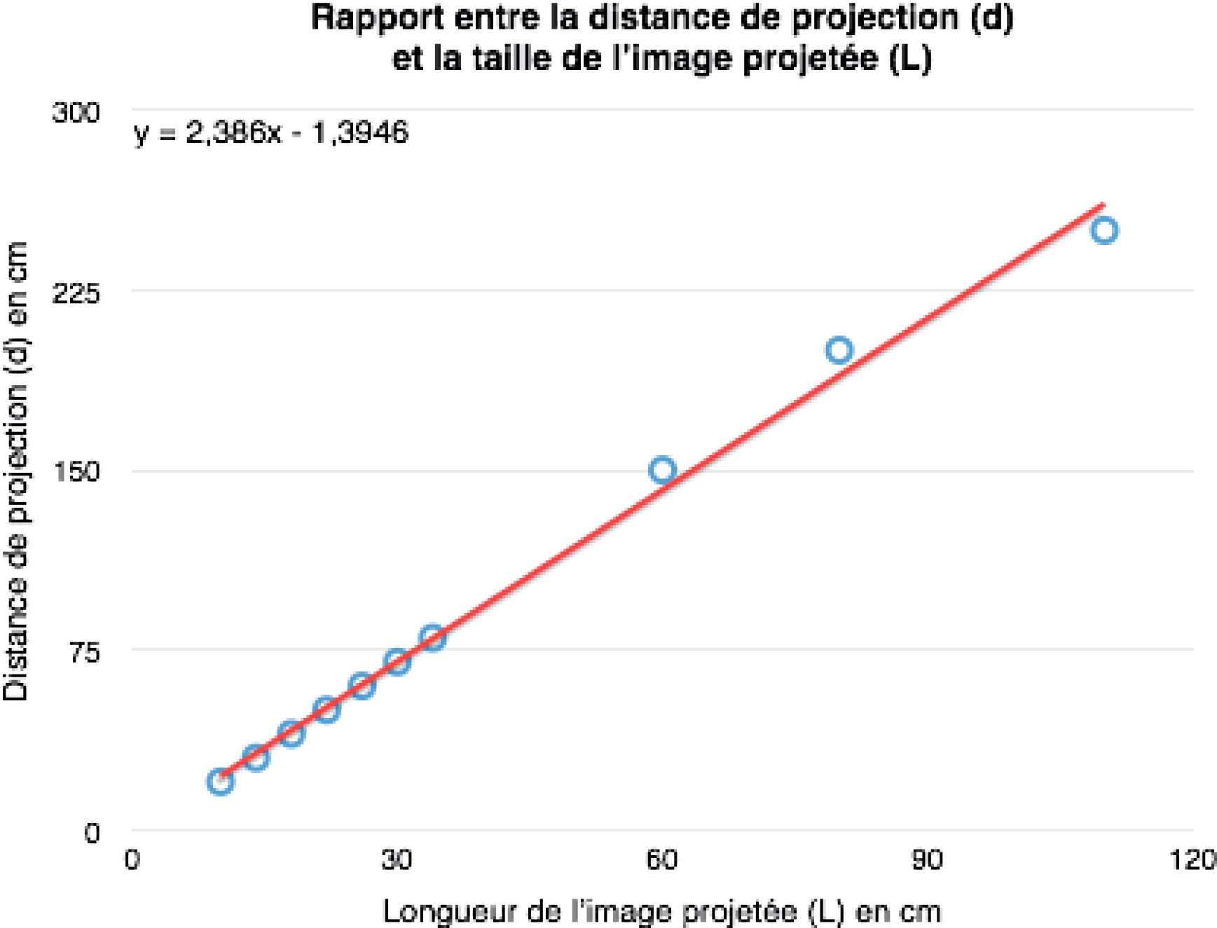 Devant le manque de hauteur sous plafond pour obtenir une projection assez grande, j'ai recherché une solution pour agrandir cette image. Il est possible de gagner une distance de projection (d) à l'aide d'un miroir afin d'agrandir la longueur de la projection (L). J'ai réalisé un certains nombre de relevé à partir du projecteur qui était à ma disposition grâce auxquelles j'ai pu réaliser une courbe et ainsi pu retrouver les valeurs idéales pour avoir la projection au sol à la bonne taille.