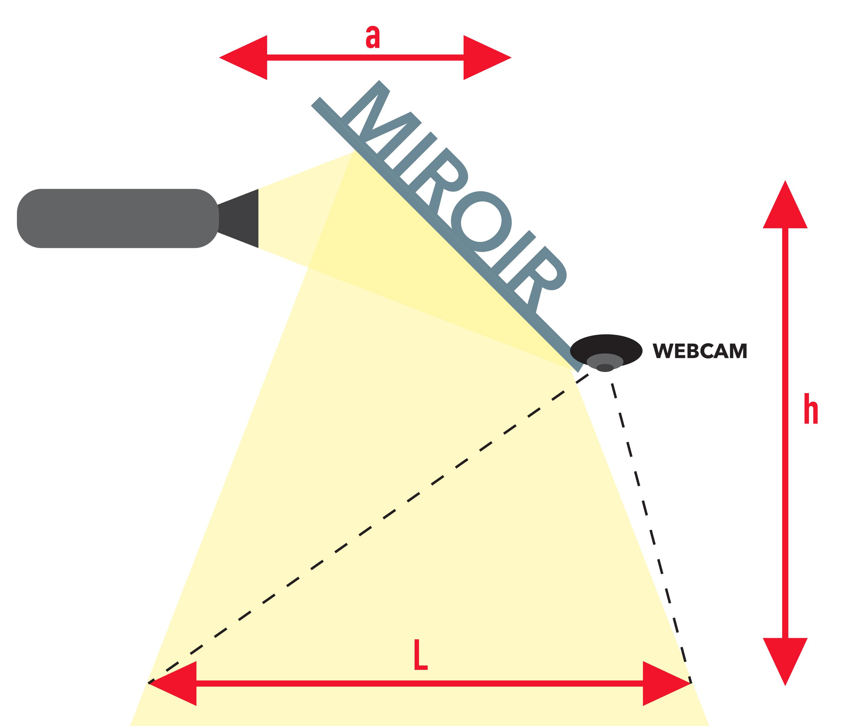 Si l'on considère que a=d, on peut calculer la taille (L) de la projection au moment ou elle rencontrera le miroir et donc en conclure la taille du miroir. Dans notre cas, pour une distance (a) environ égale à 500cm, la taille (L) de l'image au niveau du miroir sera environ égale à 200cm. Pour un système qui se veut mobile, éphémère et le moins encombrant possible devoir placer un miroir de près de 2m ne semble pas être la meilleure des solutions, il me faudra donc trouver une autre solution pour arriver à agrandir la projection avec une hauteur sous plafond faible.
