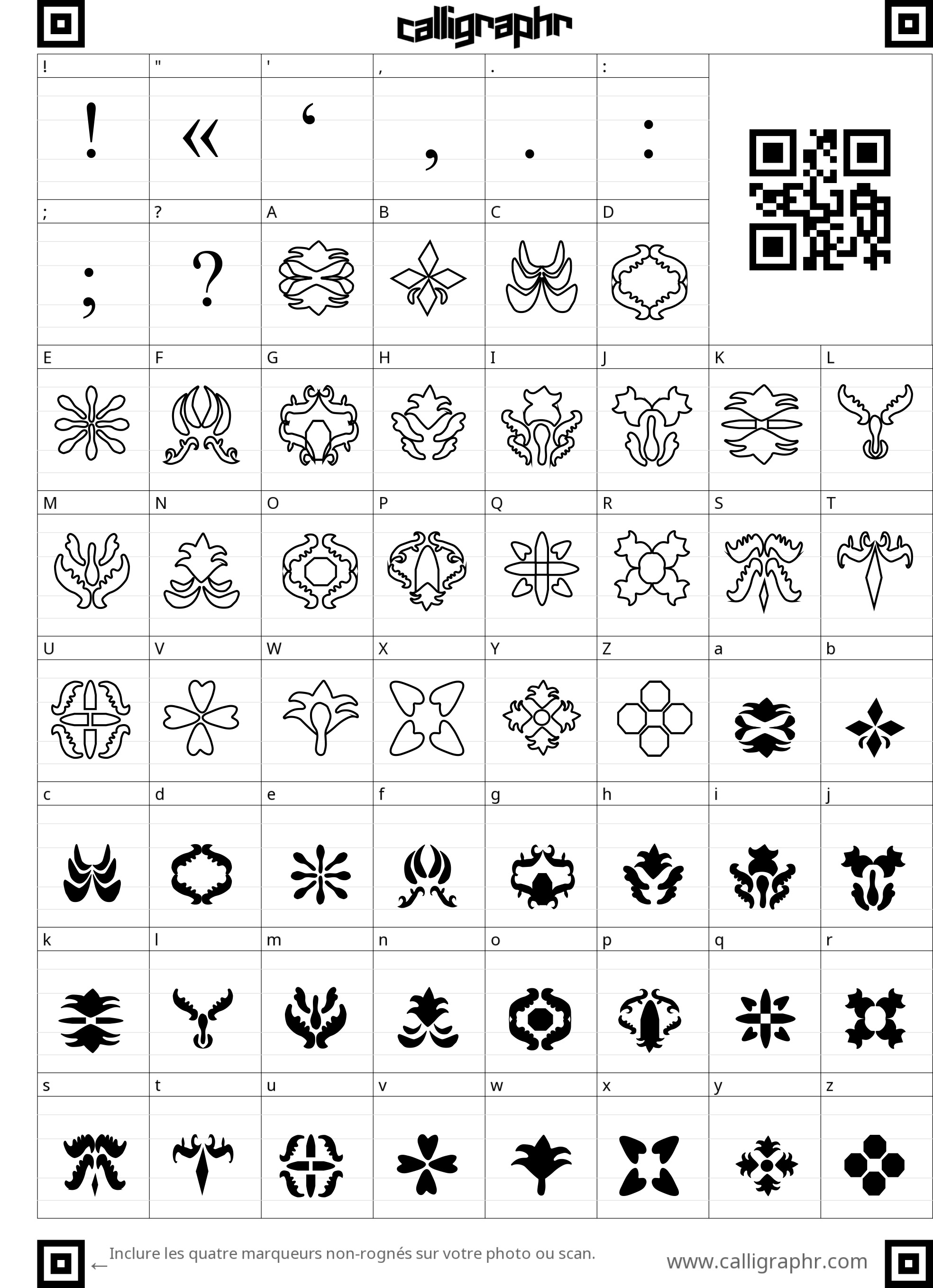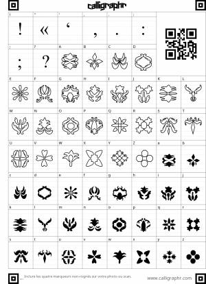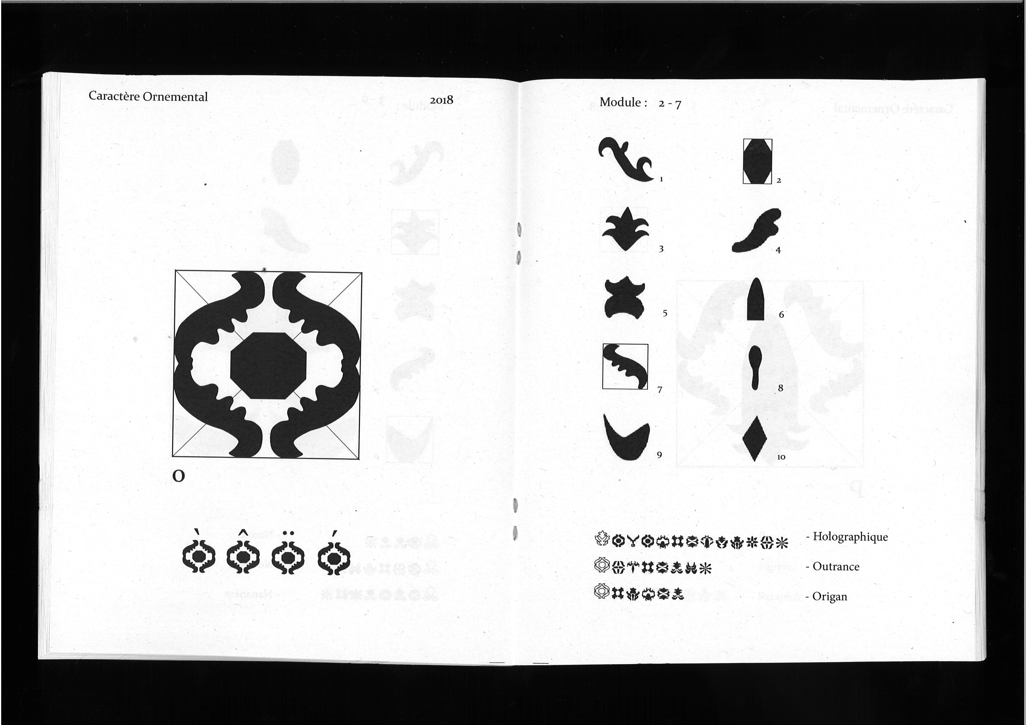 Le caractère à été créé à partir de module prélevés sur les motifs du musée Borely. Ils sont ensuite ré-agencés pour en faire un caractère à part entière. Ce caractère va me permettre de générer des textes critiquant l'ornement. Ainsi, on se retrouve avec une typographie non lisible mais déchiffrable.