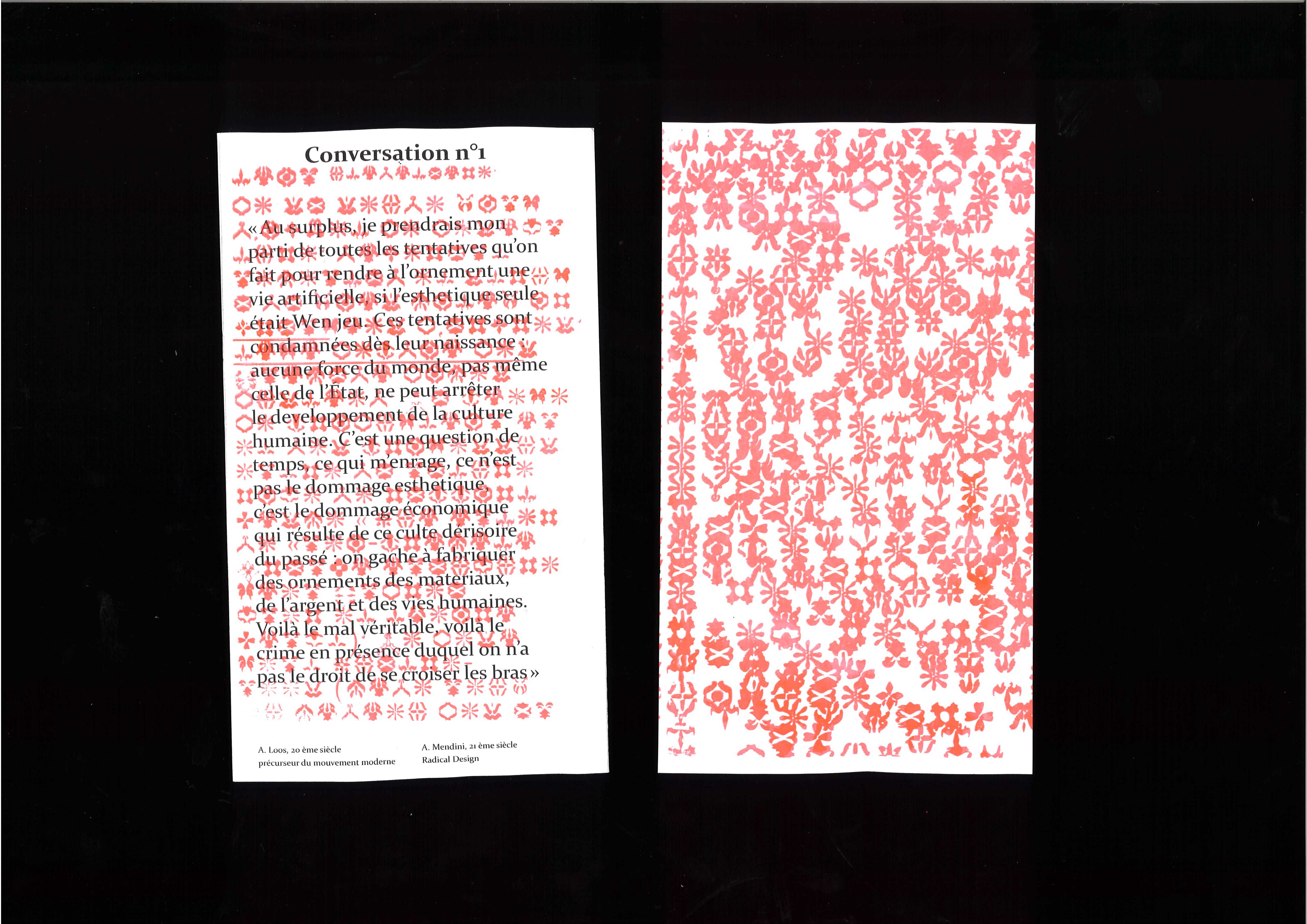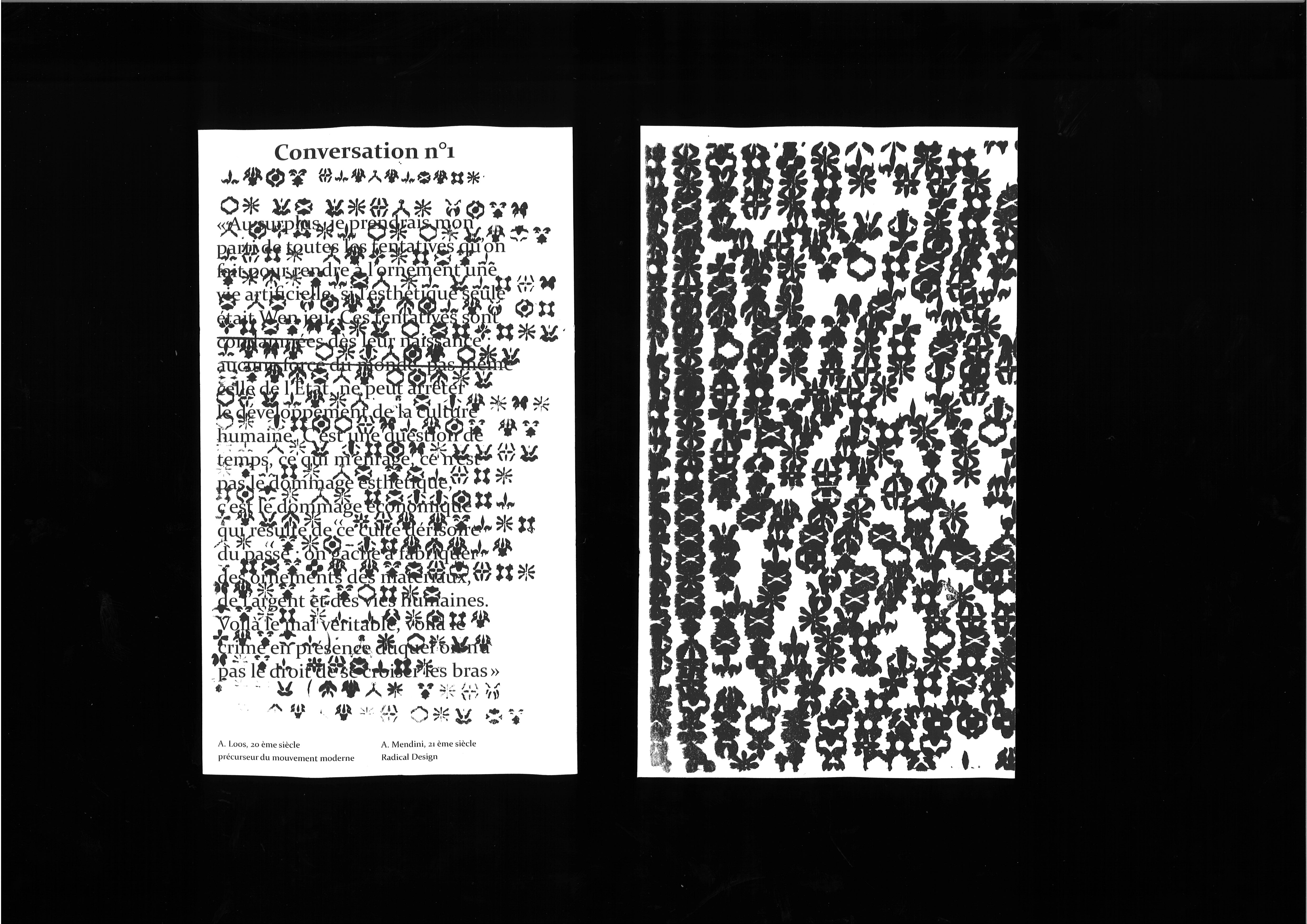 * Des textes sérigraphiés venant recouvrir les arguments “pro-ornement” dans le caractère non lisible créé grâce à Calligraphr.