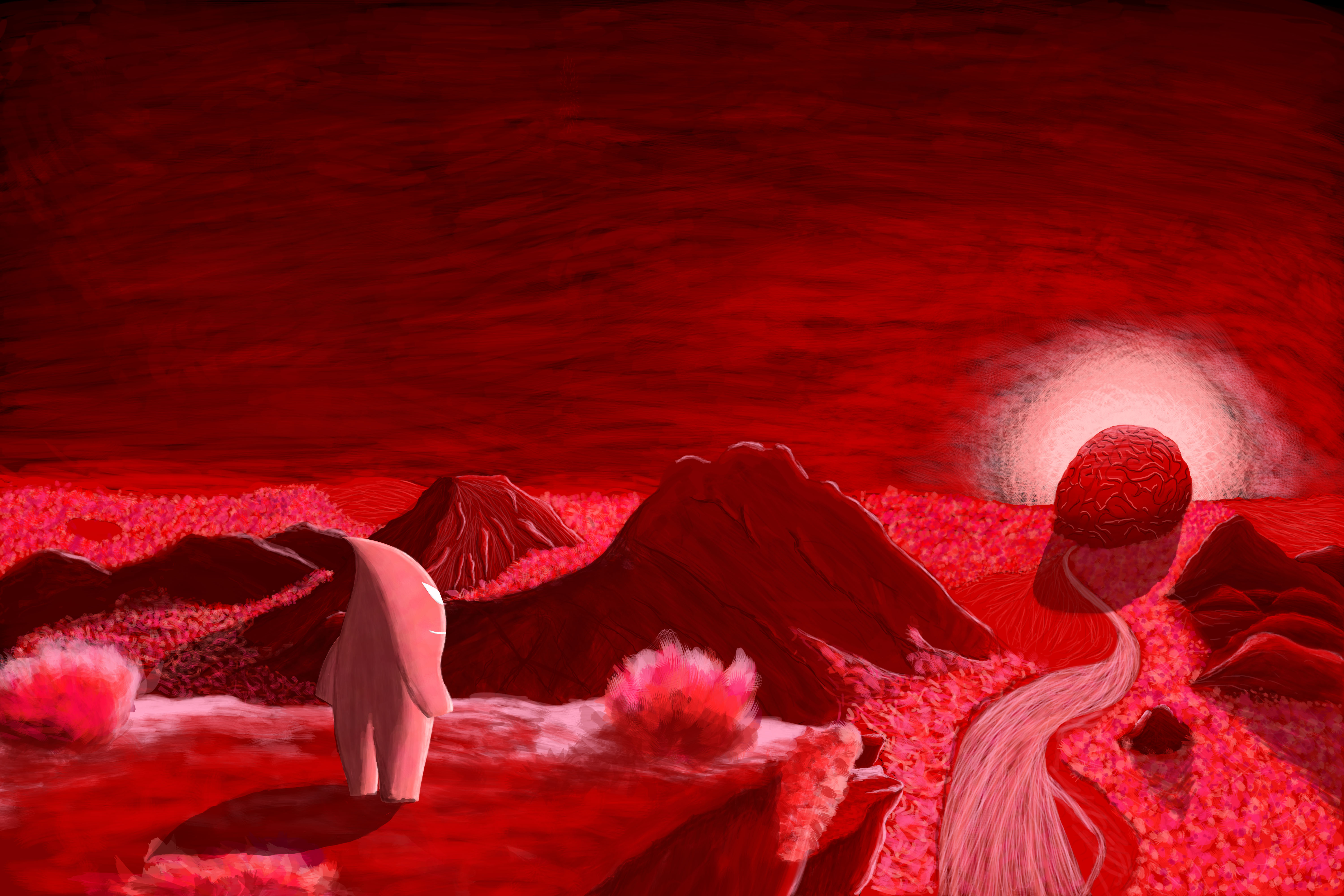 Du point de vue graphique, le choix d’un univers totalement détaché de la réalité me donne un moyen plus efficace de permettre aux joueurs de rêver, de s’abandonner au travers du jeu-vidéo. Ici, les couleurs se situent dans un camaïeu rouge pour donner un aspect sanguin à l’univers. Lorsque le corps devient numérique, les couleurs se tournent vers des nuances de gris et le paysage devient une grille électronique. Concernant les personnages principaux, j’aimerai qu’ils soient complémentaires, c’est-à-dire qu’ils soient très différents que ce soit par la couleur ou la forme, mais qu’ils s’accordent finalement l’un à l’autre à la manière du yin et du yang. D’autres personnages seront présents dans le décor sous forme de créatures amicales vivant dans le corps.