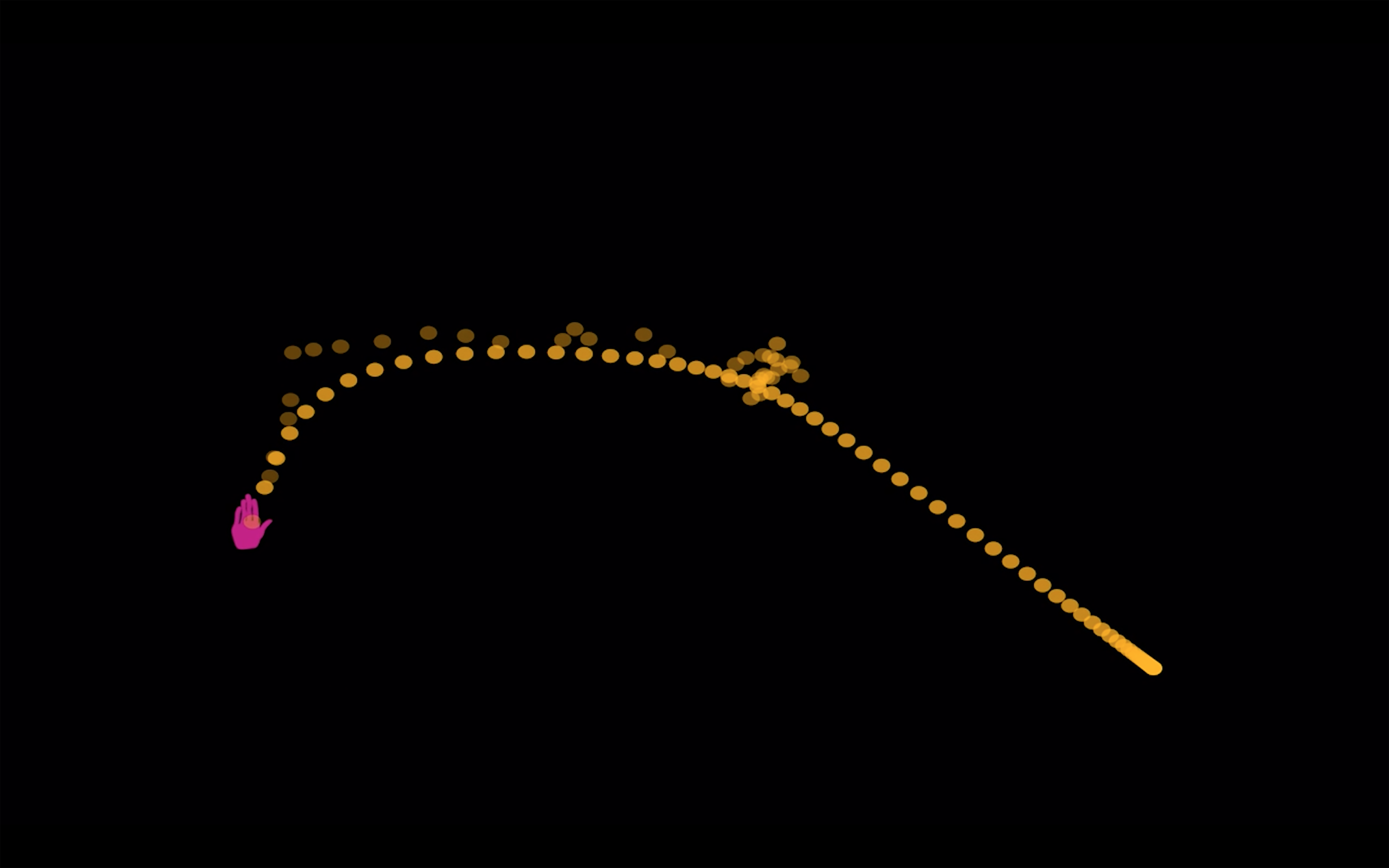 Le programme processing proposé ici a pour intention de fonctionner à la manière d’un mini-jeu. Un message nous conseille de mettre notre main gauche en avant, puis lorsque la kinect détecte la main gauche, le jeu se lance et le joueur peut ainsi dessiner des cercles partant de sa main et se déployant sur l’environnement du jeu. Les objectifs de ce dispositif sont d’observer si la jouabilité est pertinente et si elle incite le spectateur à se divertir par le déplacement de son corps dans l’espace.