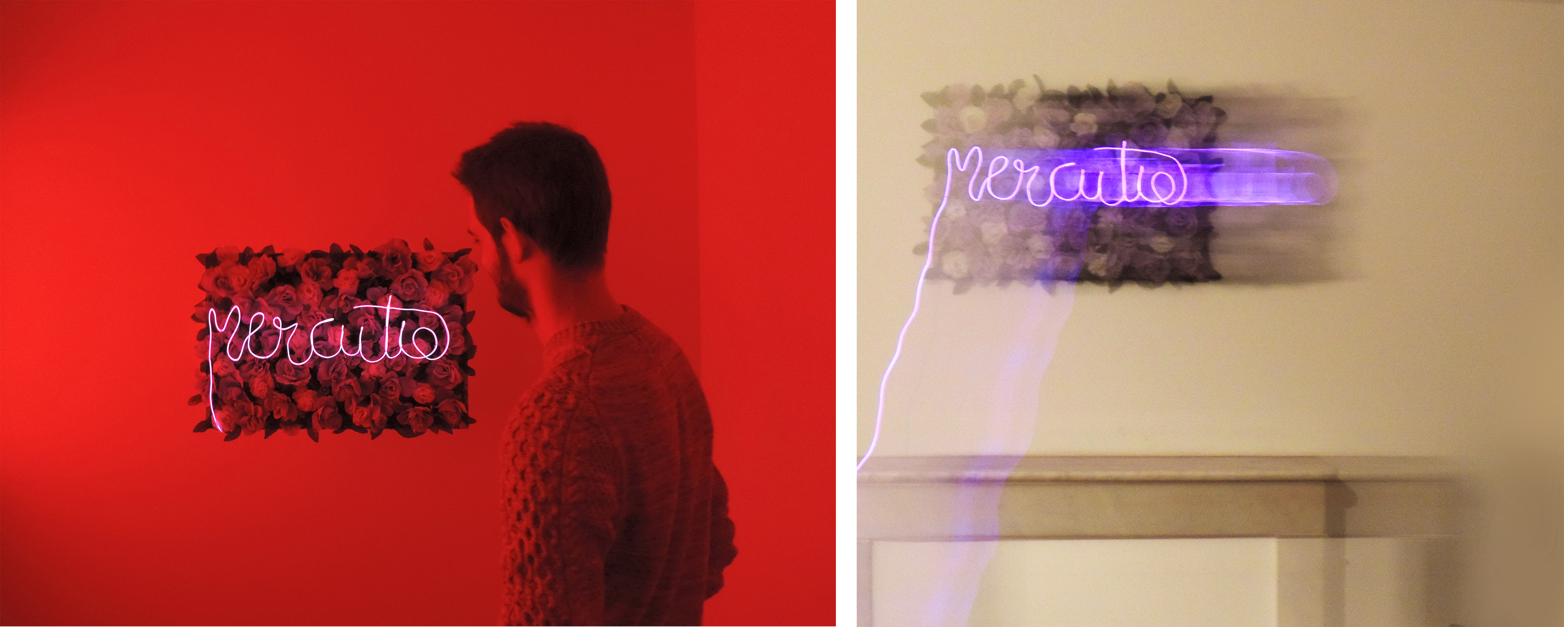 Dans ce sujet de la déclaration d’amour, j’ai choisis de traiter de déclarations d’amour différentes de celle que l’on s’imagine à première vue : le sacrifice et l’hommage. Le sacrifice est un don de soi, un don de sa vie par amour et donc peut être considéré comme une déclaration d’amour. Quant à l’hommage, il exprime du respect, de l’admiration et de la reconnaissance pour quelqu’un. C’est un témoignage d’amour. Mercutio est mort pour Romeo, il l’a défendu lors de la bagarre, il s’est battu à sa place, donc on peut donc dire qu’il s’est sacrifié. Et moi, en réalisant ce projet, je rends hommage à Mercutio. En effet, le fait simplement d’écrire le nom d’une personne dans un lieu est perçu comme une preuve d’amour, de reconnaissance, par exemple le nom de son/sa bien aimé gravé sur un arbre ou encore le nom d’une personne disparue inscrit en doré sur sa pierre tombale. Le fond de fleurs artificielles rappelle également le cimetière, mais elles ont été choisies aussi pour apporter un aspect kitsch au projet. Puisque le sujet de la déclaration d’amour est un sujet plutôt kitsch, j’ai voulu faire une réponse kitsch. Le néon aussi participe à cet aspect rétro de mauvais goût et participe également à la notion d’hommage puisqu’il met en lumière le nom de Mercutio. Le néon possède une symbolique du temps et de la mort. En 2011, Douglas Gordon a écrit : « Every time you switch me off, we die a little. » (A chaque fois que vous m’éteignez, nous mourrons un peu), en 2010, le néon de Stefan Brüggemann nous dit : « This work should be turn off when I die. » (Cette œuvre devra être éteinte à ma mort).
