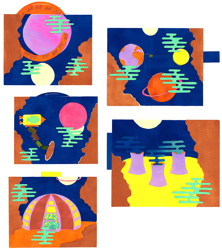 Face aux nombreux problèmes écologiques, pourquoi ne pas tout délocaliser dans l’espace ? Une question que se pose aussi de nombreux scientifiques, dont la NASA, et qui donne le point de départ à ce projet. Des idées d’abord illustrées sous forme de pop up, grâce à des disques à tourner et des languettes à tirer, pour permettre au spectateur de plonger dans cette utopie spatiale un peu naïve et onirique.
