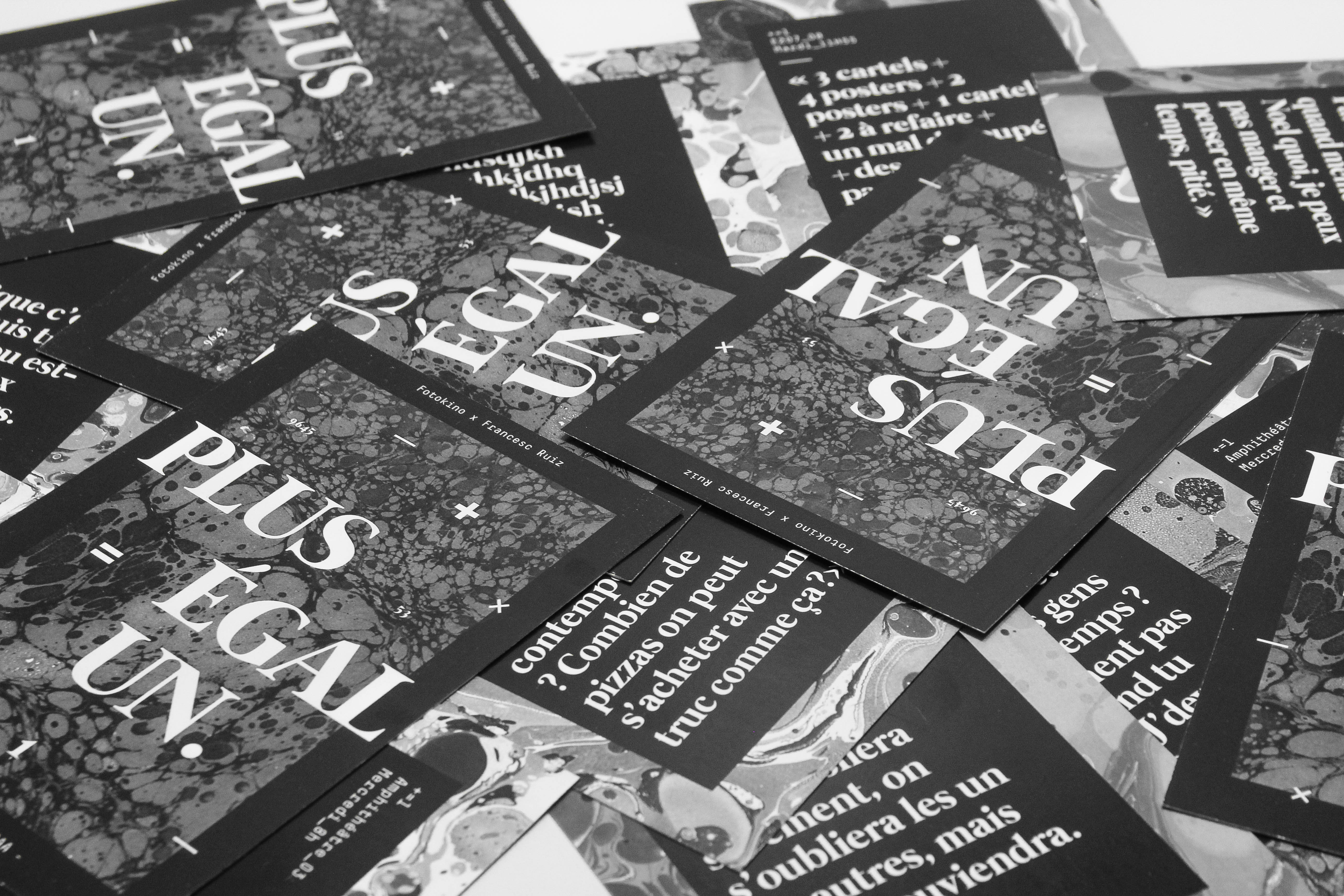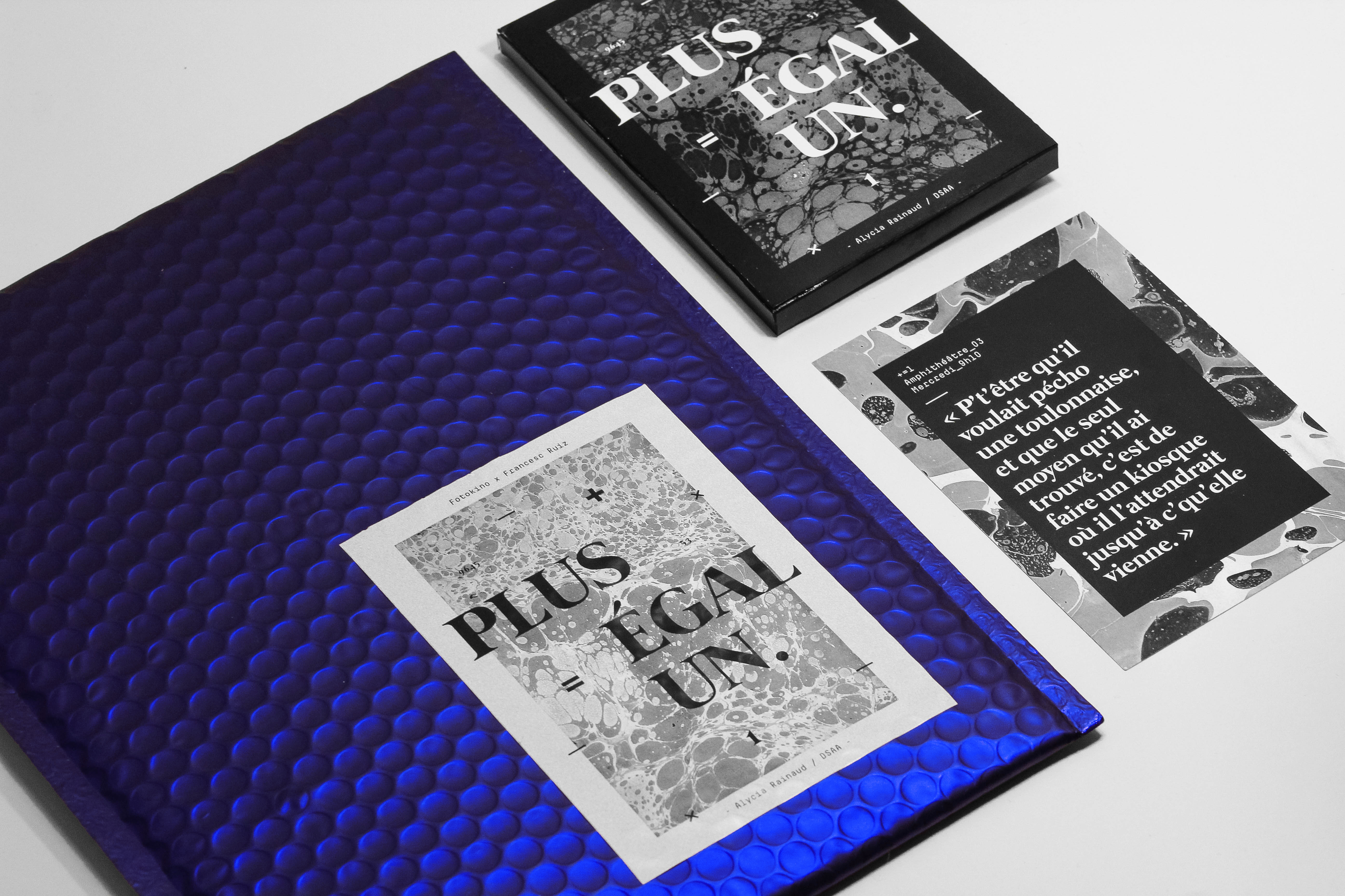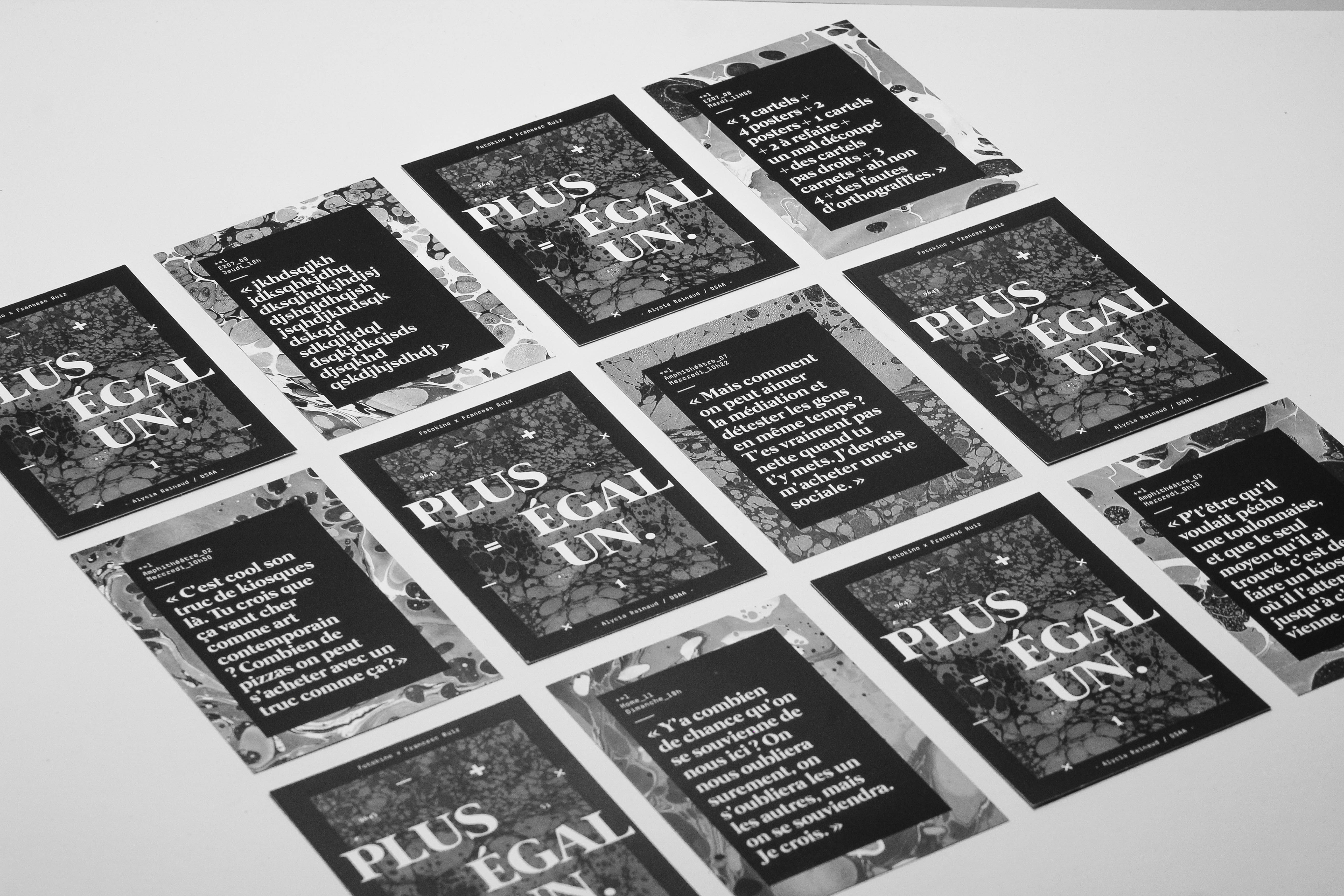 Plus, c’est une aventure de commissariat d’exposition collectif qui a réunie 53 étudiants durant un semestre, autour de l’oeuvre des Kiosques de Toulon, par Francesc Ruiz. Égal, c’est le résultat mené avec succès d’une équation qui prend la forme d’une exposition, dans un nouveau lieu, la galerie Fotokino à Marseille. Égal, c’est aussi l’envie de développer une problématique : la documentation de l’art contemporain. Un, c’est une expérience personnelle en tant qu’étudiant de première année en DSAA, une expérience enrichissante, nouvelle, complexe, mais belle. Plus Égal Un, c’est un reccueil de pensées, de bribes, qui retracent le parcours de cette aventure, vécue de l’intérieur et de manière authentique.
