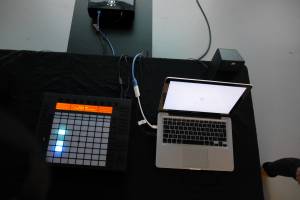 Le déclenchement des samples se fait par le biais d’un clavier midi (ici le push Ableton). Une touche colorée est assignée à un couple de samples (vidéos et sons), qui lors d’une première pression déclenche une animation et l’arrête lors d’une deuxième. La gestion des images et des sons est programmée par le logiciel Resolume Arena.
