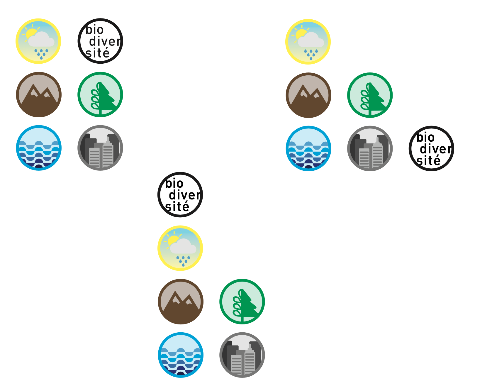 Pour cet axe, l'objectif était de représenter les différents aspects compris dans la biodiversité, c'est-à-dire le climat, les forets et l'agriculture, les massifs, les mers océans et cours d'eau, mais aussi la ville. Le tout dans un langage universel ⇒ les pictogrammes.