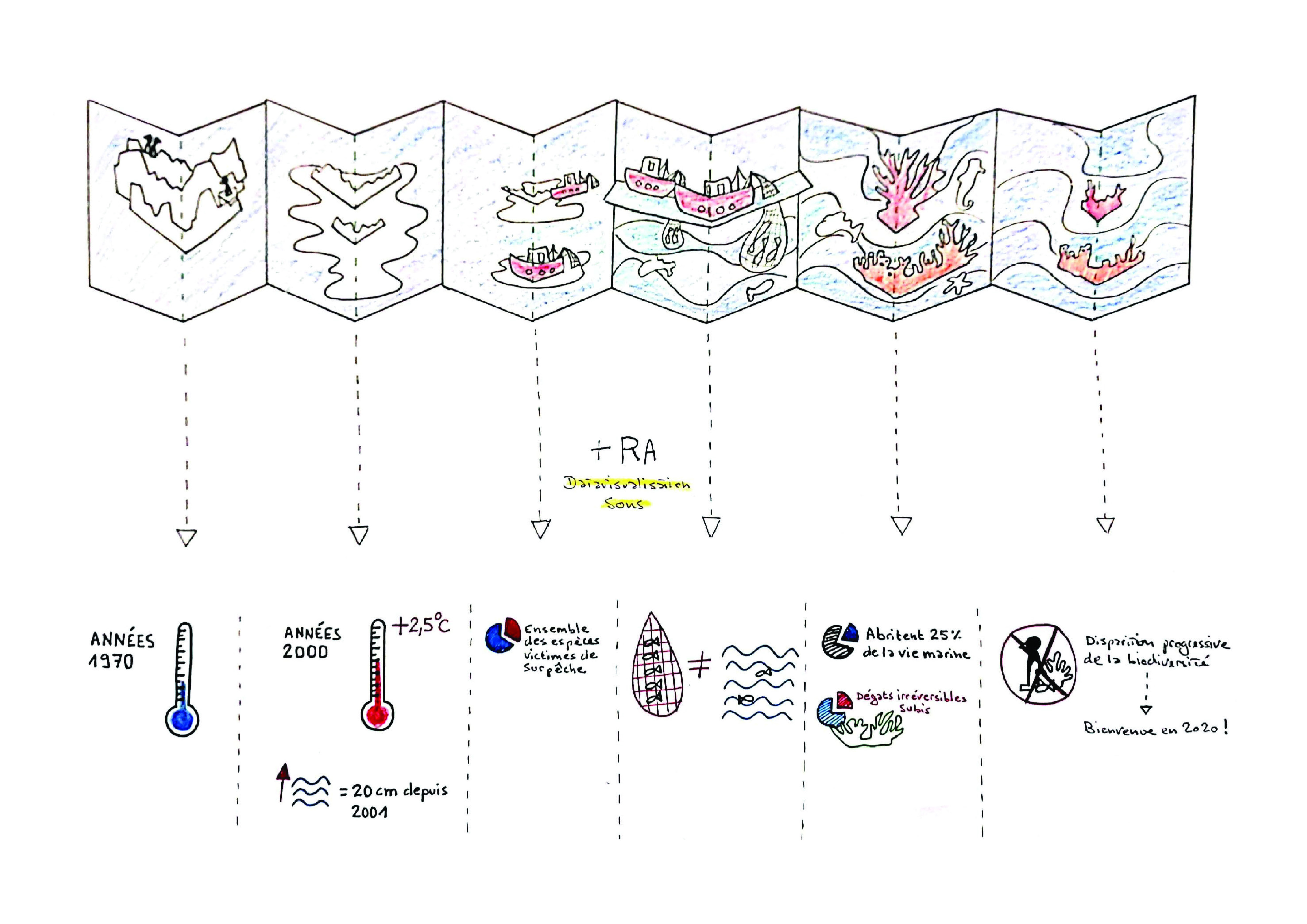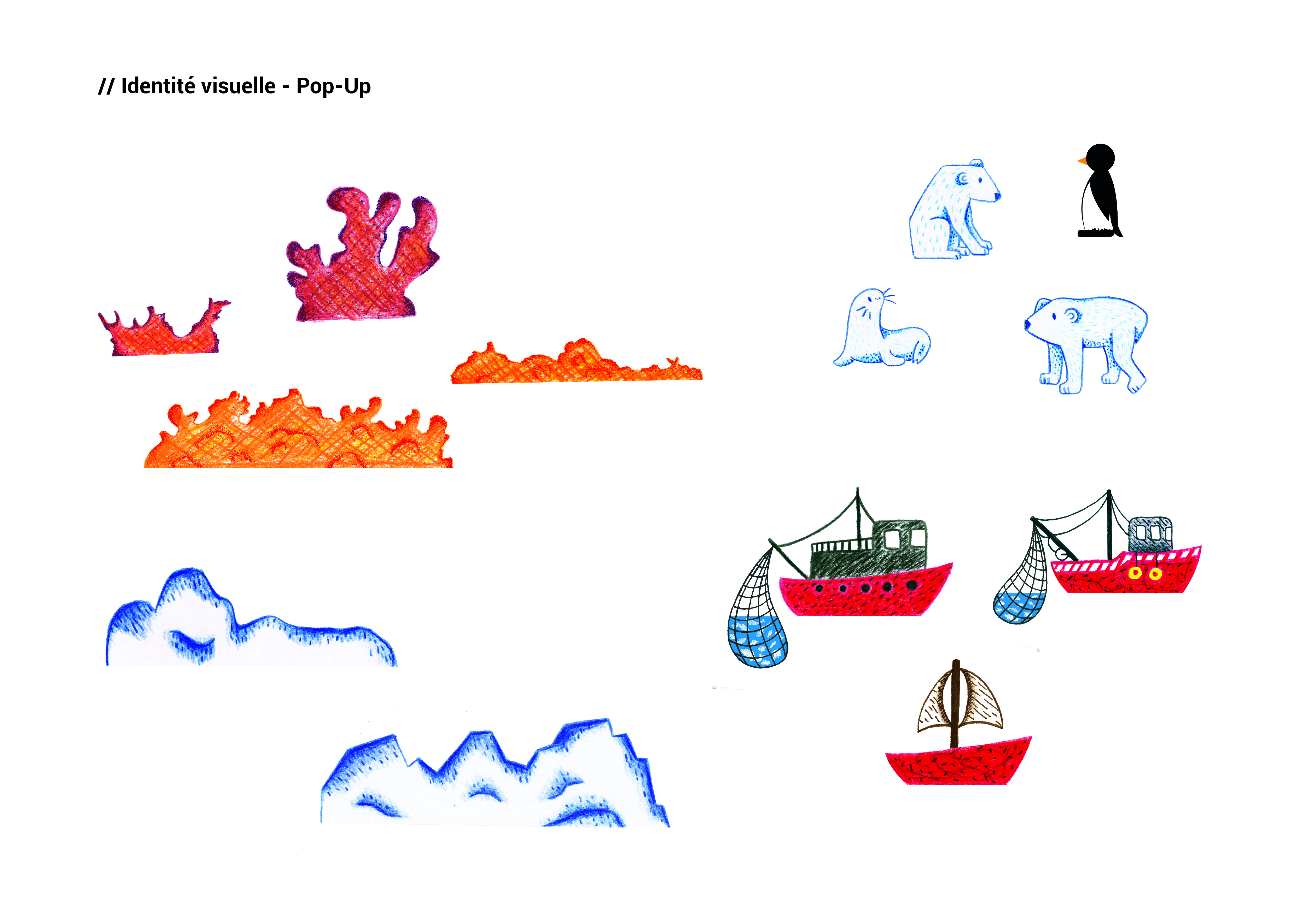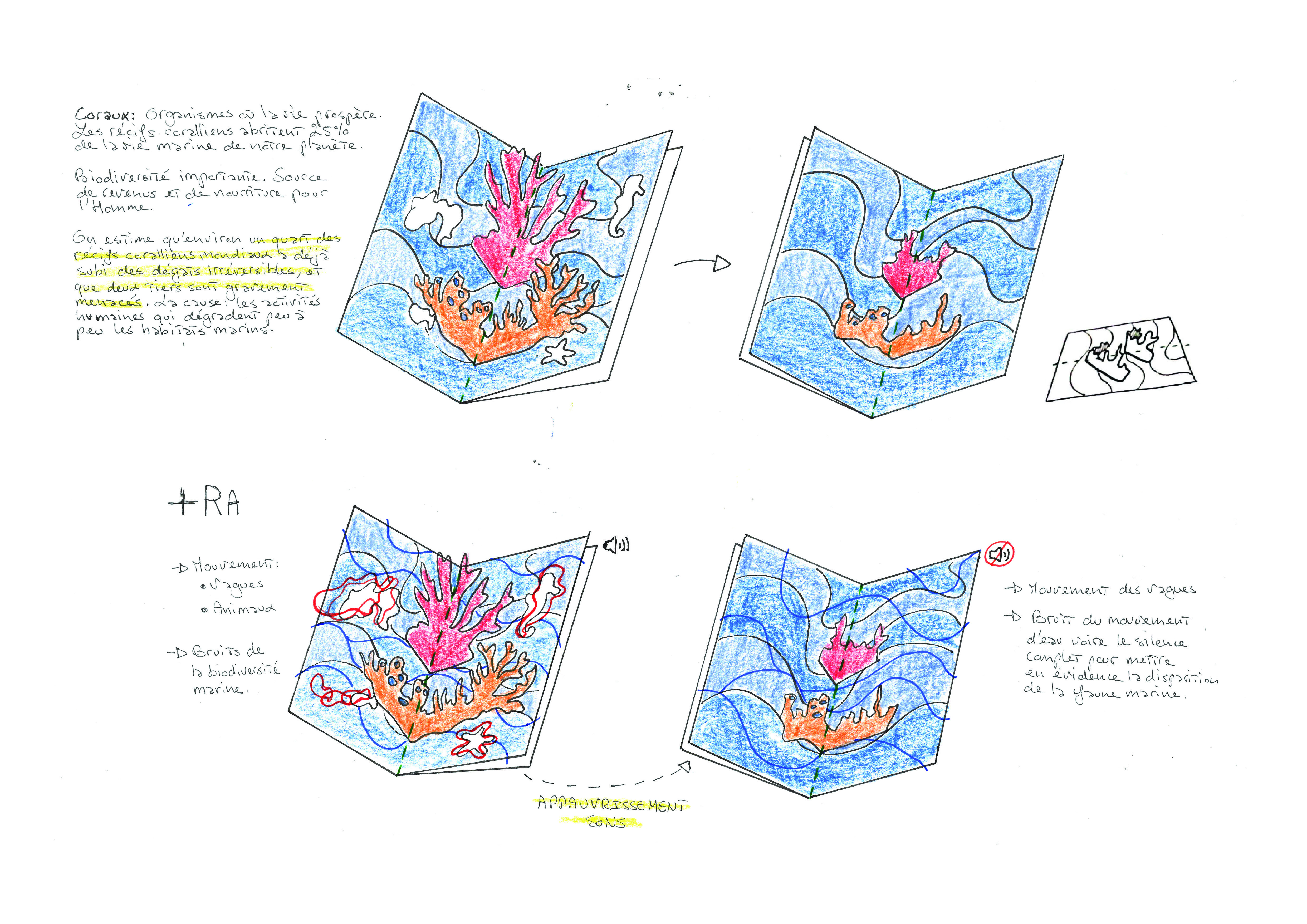 Pour le projet du Pop-Up augmenté, l’idée est de proposer plusieurs cartes formant une narration. L’objectif est de sensibiliser, de faire prendre conscience de la situation actuelle, des impacts subis par la biodiversité de par nos actions. Ainsi, cette narration mettrait en scène les différents problèmes actuels liés au milieu marin : fonte des glaces, hausse du niveau des mers et océans, surpêche, acidification, réchauffement de la mer, disparitions de zones et espèces marines.