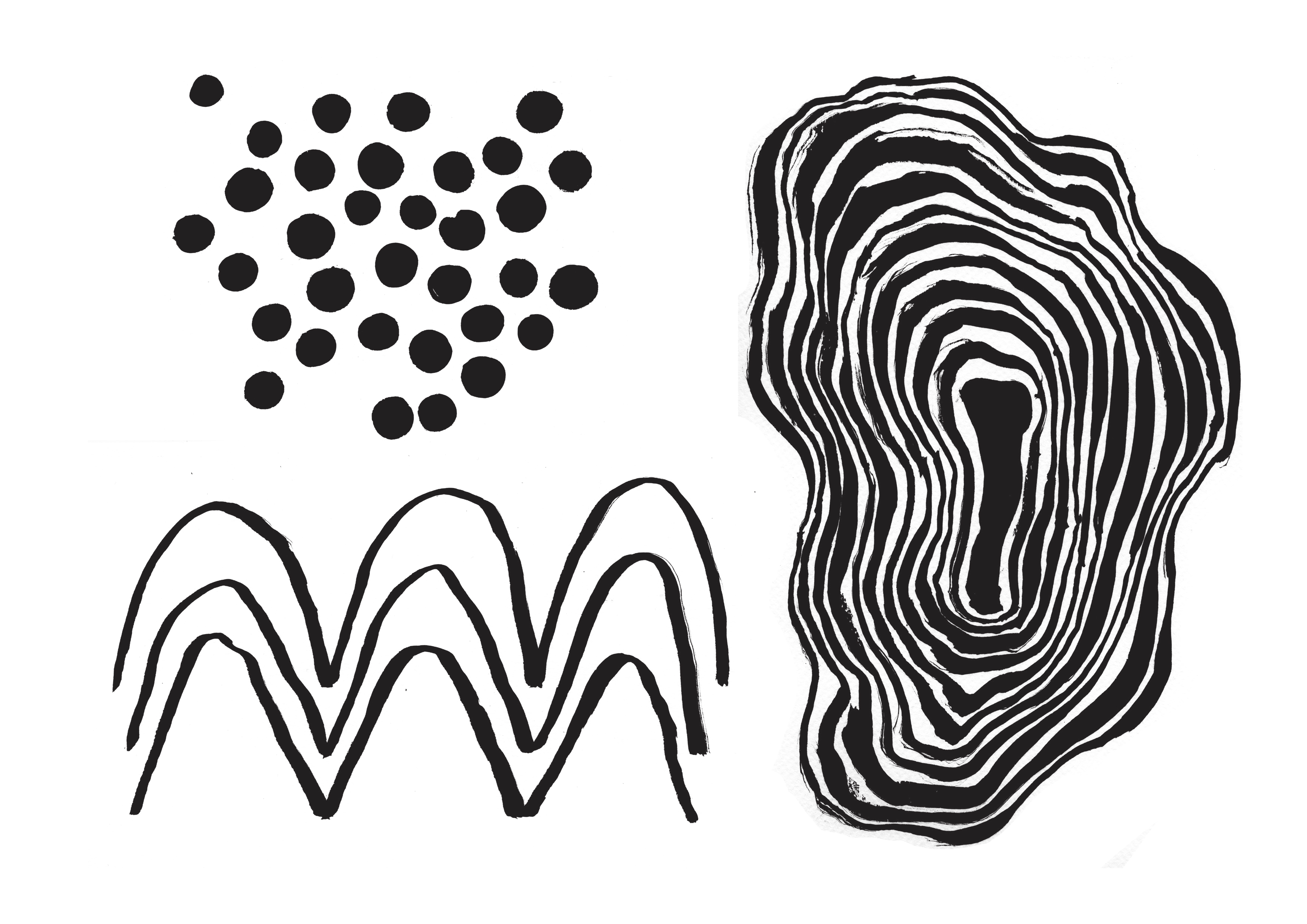 Mon répertoire formel a été crée par la découpe de la forme à même le papier. J’ai tenu à donner une grande importance au papier dans mon projet au moment de la réalisation pour le caractère sensible et ludique qu’il m’a permis d’apporter. Mon répertoire de trames a lui aussi été crée de manière spontanée avec de l’encre de chine et des outils variés.