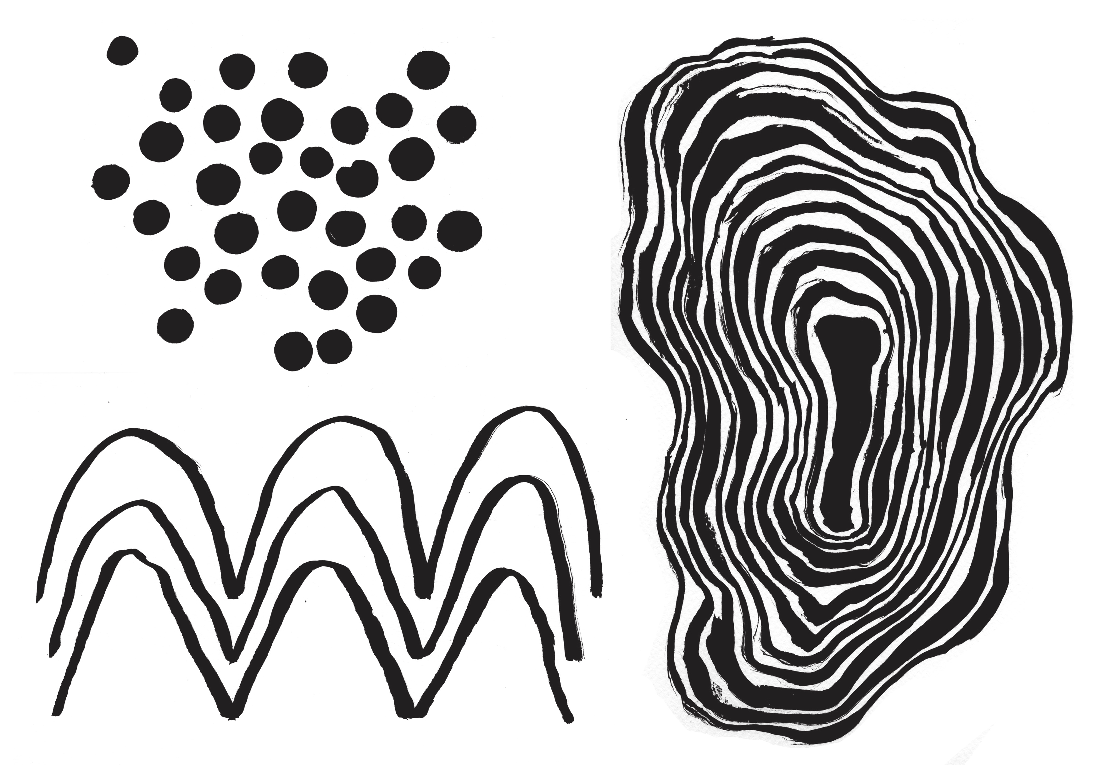 Mon répertoire formel a été crée par la découpe de la forme à même le papier. J’ai tenu à donner une grande importance au papier dans mon projet au moment de la réalisation pour le caractère sensible et ludique qu’il m’a permis d’apporter. Mon répertoire de trames a lui aussi été crée de manière spontanée avec de l’encre de chine et des outils variés.