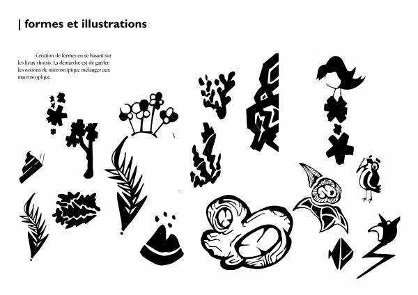 Les animaux, ont unstyle visuel un peu alléger; ils seront présentés de manière assez enfantine, assez légère car, la plupart des espèces microscopiques que l’on retrouve dans les sols peuvent être effrayantes pour une partie du public. L’objectif n’est pas de dérouter le visiteur de la biodiversité mais de le faire se sentir impliqué par les problèmes qui y sont liés. De plus, cela permet de donner une cohérence visuelle entre les grands et les petits animaux. Le but final est de créer un univers assez déconnecté du nôtre ou les échelles se mélangent, afin de créer une sorte de mini écosystème indépendant.