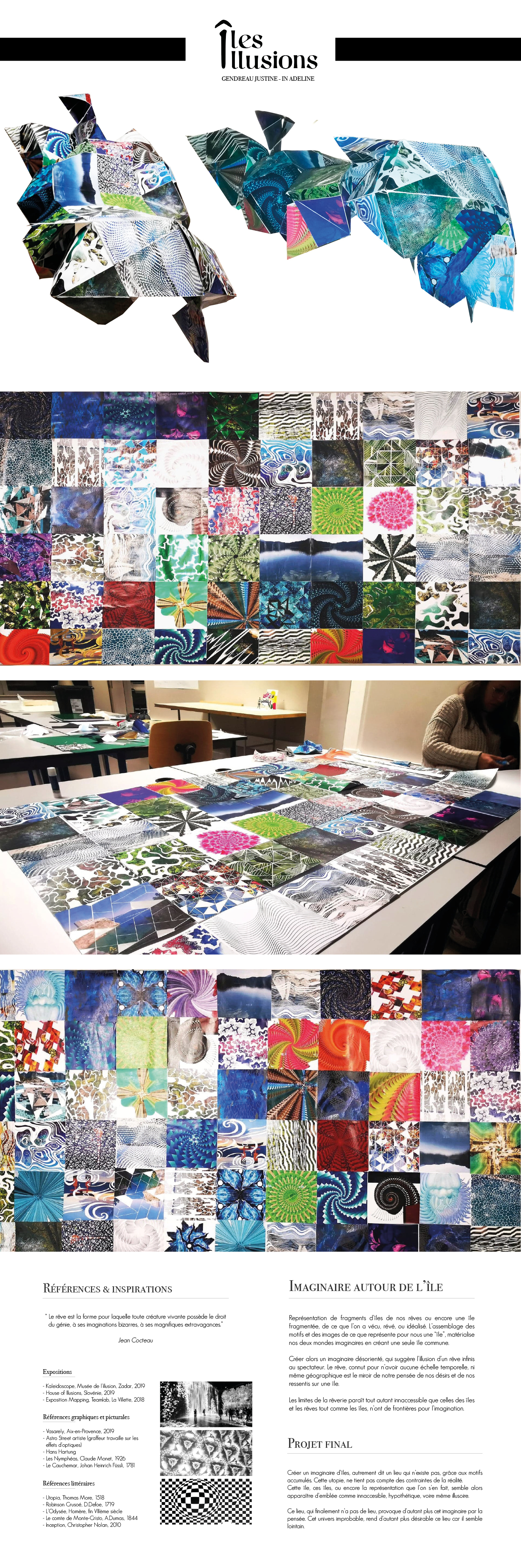 Pour le sujet de l’île, Adeline et moi avons choisi le thème de l'île l'imaginaire. Pour cela nous avons représentés l’île sous la forme de fragments de rêve qui correspondent à des lieux, des désirs, des impressions que nous vécu et nous-même ressentis. La représentations des fragments à la manière du kaléidoscope est volontaire. Ils reflètent une utopie d’une île inaccessible, hypothétique et totalement illusoire. Un lieu qui finalement n’a pas de lieu, un lieu lointain et conçut de toute pièce par notre imaginaire.