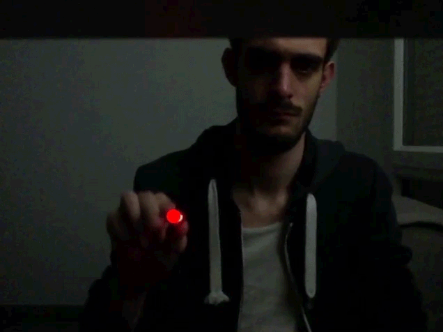 La réflexion qui a permis de réaliser ce prototype est la même que pour le prototype avec la Kinect, mais, celui-ci contrairement à l’autre, veut répondre aux soucis techniques de la Kinect qui ne peut faire du cas par cas. C’est ainsi que j’ai décidé d’employer un led, une source lumineuse pour permettre d’identifier les différents utilisateurs du prototype. Chaque utilisateur possède une couleur spécifique, qui produit individuellement, des formes, des graphiques différents. Ainsi, les utilisateurs peuvent s’ils le souhaitent, s’échanger les sources lumineuses pour créer une œuvre singulière basée sur l’individualisation et/ou la coopération, la co-évolution de l’environnement dans lequel la création ce fait.