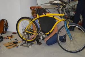 L'objectif est de construire un vélo pour générer de l'énergie avec vos muscles. « Il y a quelques mois, nous avions construit un vélo projecteur pour faire directement des projections sur les murs tout en circulant, mais très rapidement, nous avons été limités par son autonomie électrique. D’où l’idée de créer une source électrique directement reliée au vélo », explique Miguel Rodriguez, personne ressource du fablab LFO coordonnant l’équipe du workshop. Pour générer de l’électricité, ils ont équipé le vélo d’un moteur à aimant permanent transformé en dynamo. Le courant part ensuite dans un régulateur de tension, permettant de transformer du 12 V en 220 V, et est stocké sur batterie.De quoi alimenter 3 PC, une perceuse, un mixeur ou encore une centaine de LEDs. L’expérience du workshop lui donne déjà d’autres idées pour développer le vélo, notamment celle d’explorer d’autres sources de production énergétique.