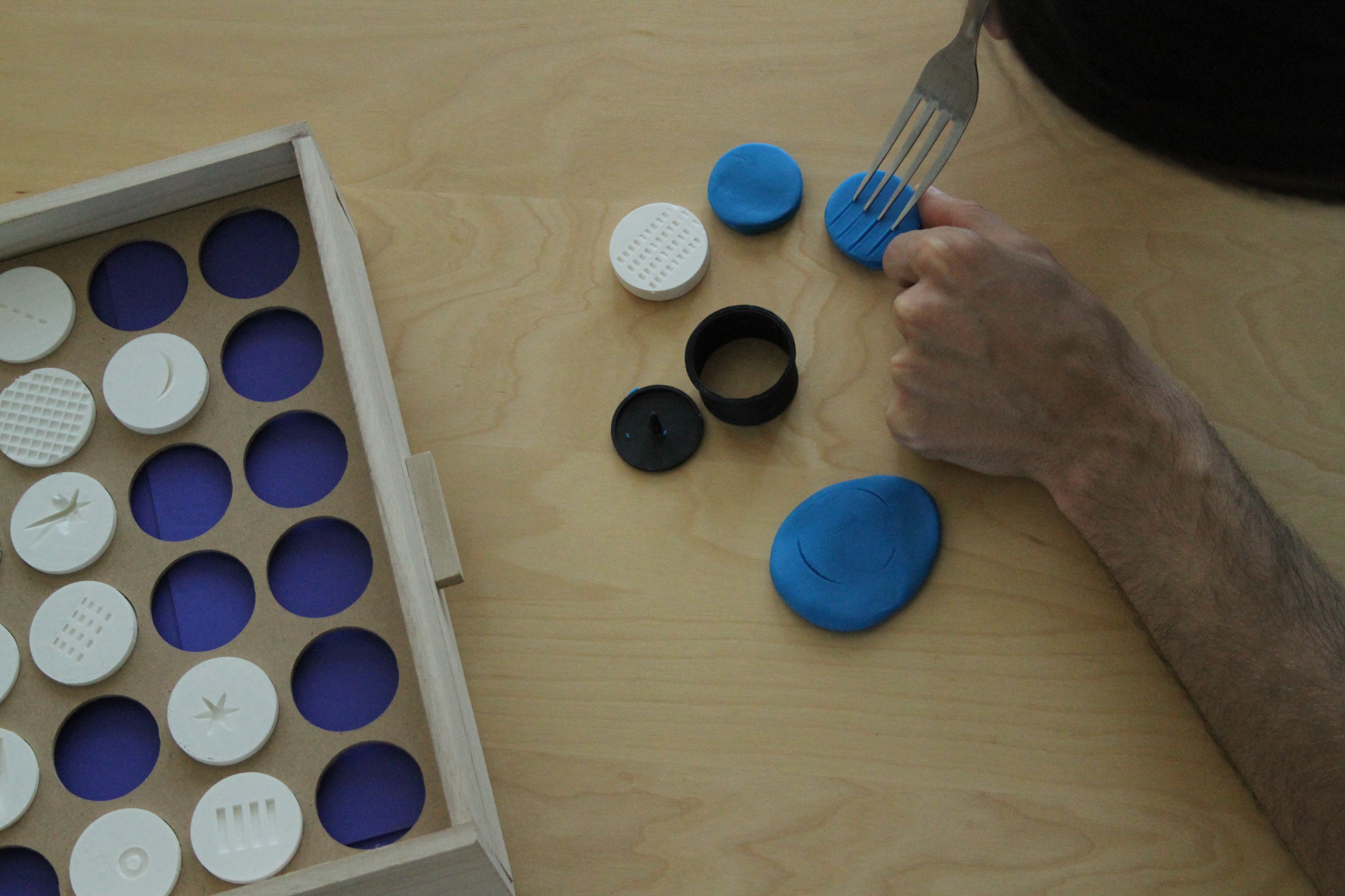 Le MACMUC est composé d'un ensemble d'outils concrets présents dans notre quotidien, un bloc de pâte à modeler et des formes imprimées en 3D. Cet atelier permet d'associer un outil, un geste et une empreinte à un type de son pour mémoriser cette typologie complexe.