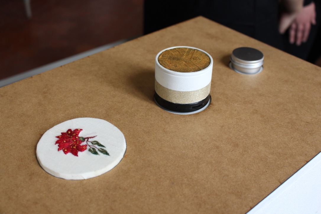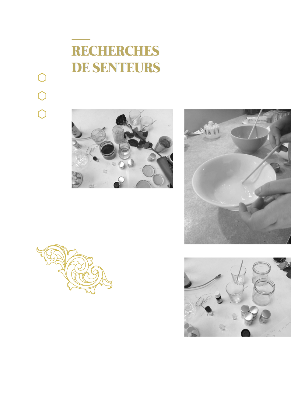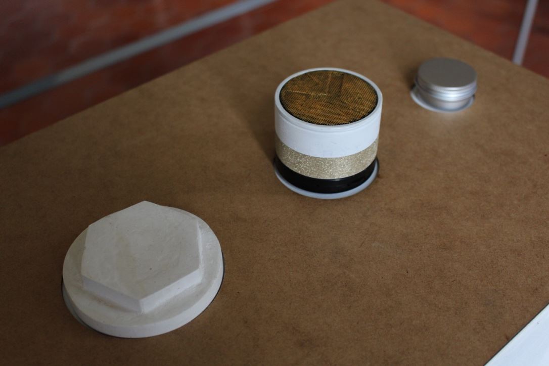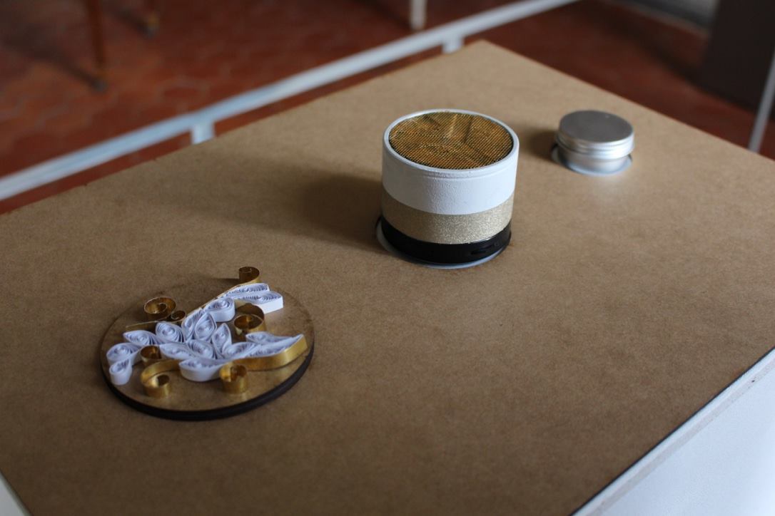 À l’annonce du projet ayant pour thème l’Ornement et le Motif, nous nous sommes orientées vers une approche sensorielle des motifs de la chambre d’apparat au Château Borély. En effet, à travers l’histoire du Château et du 17e-18e siècle, nous avons pu constater que le motif était extrêmement présent notamment sur les textiles, les senteurs et plus précisément les fragrances faisaient partie intégrante de la vie, reflétaient une appartenance sociale et enivrait les espaces. (ex référence Le Parfum de Patrick Süskind). La musique, quant à elle, animait et donnait vie au château (ex Bach, Vivaldi, Mozart) tout comme les différentes conversations et bruitages créaient une atmosphère unique (ex Orgueil et Préjuges de Jane Austen ou encore Les Liaisons Dangereuses de Pierre Choderlos de Laclos). Ces éléments liés aux sens, ont éveillés en nous, l’envie de donner vie aux motifs présents dans la chambre d’apparat, un lieu intime et singulier, témoin d’une époque révolue. La chambre d’apparat est un lieu unique, réservé aux hôtes de marque, ainsi qu’à la dame du logis à la belle saison. elle est représentative d’un statut social. À l’origine de la généalogie de la famille Borély, nous retrouvons Joseph Borély, ainsi que son épouse Claire de Rimbaud, qui fût la première dame à avoir investi ce lieu symbolique qu’est la chambre d’apparat. Cette histoire a de ce fait inspiré le titre du projet « Les Charmes de Claire » comme un hommage. La pièce ici rassemble les meubles les plus précieux du Château, notamment le lit étant la pièce maitresse de l’espace, appuyé au mur, où se dresse une indienne représentant un arbre de vie majestueux, qui trouve sa base dans le lit lui même. Le motif de cet arbre se propage dans toute la pièce, tant sur les murs que sur les meubles et les objets. On retrouve plusieurs volutes en relief faisant office de moulure, où l’on peut distinguer des feuilles d’acanthe. Le nombre conséquent de meubles et d’assises, témoigne d’une volonté de recevoir, et de rendre vivant un lieu intime. La marqueterie d’inspiration italienne, est également présente dans cette chambre, composée de bois nobles, et de nombreux ornements, tel que la serrure. La totalité de la pièce est assise sur la traditionnelle tomette hexagonale provençale, que l’on retrouve dans tout le Château. Elle permet d’avoir un sol lisse, doux et frais. L’atmosphère créée dans la chambre d’apparat, est une représentation d’un ailleurs, bien que tout ici, soit recréée de toutes pièces (cf. prise vidéo de la reconstruction par l’agence Rubigo) Notre interprétation face à ce projet, s’articule sous la forme d’un dispositif sensoriel, composé de 4 présentoirs, dont la silhouette est inspirée des pieds du mobilier de la chambre. Chaque présentoir est la représentation sensorielle d’un motif extrait de la chambre. Sur la partie supérieure de chacun, on retrouve à chaque fois, trois cercle, l’un étant associé au sens du touché, à l’ouïe et à son motif sonore ou Leitmotiv (inspiré par l’oeuvre de Terry Riley) et à l’odorat, la vision étant déjà face au spectateur. Le premier présentoir, est associé au motif de la fleur de vie, le second à la tomette, le troisième à la feuille d’acanthe et le dernier à la serrure. La fleur de vie est représentée à la fois par une broderie délicate, une odeur florale envoutante, et un son printanier s’élevant. La tomette quand à elle, est représentée plastiquement par un moulage en plâtre/béton ?, à la fois poreux, frais, mais aussi doux, vernis et lisse ; un son affirmé, profond, rythmé, et une odeur minérale marquée. La feuille d’acanthe est reprise via la technique du quilling, très largement inspirée des reliquaires domestiques du 17e-18ème siècle, son odeur de feuillage et sa sonorité aux volutes marquées. Enfin, le motif de la serrure se voit représenté par un alliage minutieux en métal (plaque offset), une odeur puissante et boisée en rappel à la marqueterie ainsi qu’un son à la fois grave et mystérieux.
