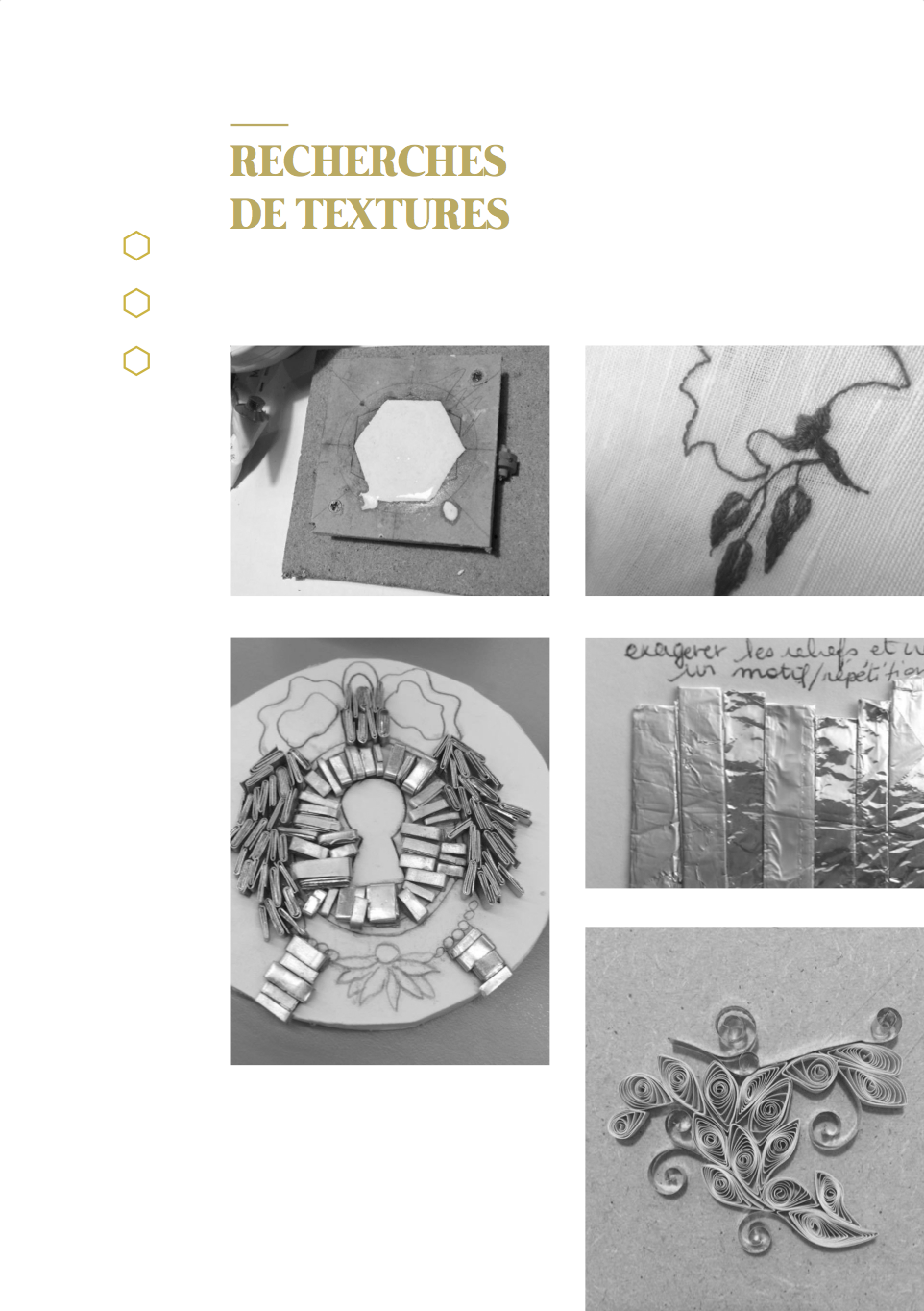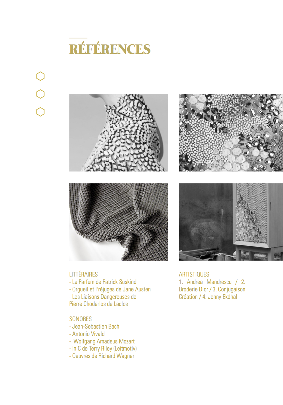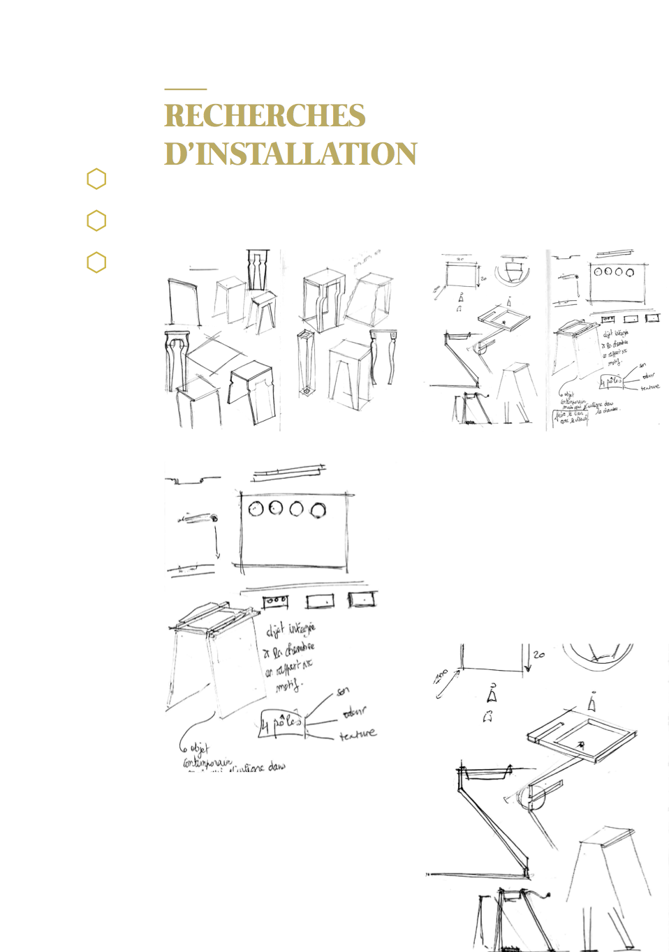 À l’annonce du projet ayant pour thème l’Ornement et le Motif, nous nous sommes orientées vers une approche sensorielle des motifs de la chambre d’apparat au Château Borély. En effet, à travers l’histoire du Château et du 17e-18e siècle, nous avons pu constater que le motif était extrêmement présent notamment sur les textiles, les senteurs et plus précisément les fragrances faisaient partie intégrante de la vie, reflétaient une appartenance sociale et enivrait les espaces. (ex référence Le Parfum de Patrick Süskind). La musique, quant à elle, animait et donnait vie au château (ex Bach, Vivaldi, Mozart) tout comme les différentes conversations et bruitages créaient une atmosphère unique (ex Orgueil et Préjuges de Jane Austen ou encore Les Liaisons Dangereuses de Pierre Choderlos de Laclos). Ces éléments liés aux sens, ont éveillés en nous, l’envie de donner vie aux motifs présents dans la chambre d’apparat, un lieu intime et singulier, témoin d’une époque révolue. La chambre d’apparat est un lieu unique, réservé aux hôtes de marque, ainsi qu’à la dame du logis à la belle saison. elle est représentative d’un statut social. À l’origine de la généalogie de la famille Borély, nous retrouvons Joseph Borély, ainsi que son épouse Claire de Rimbaud, qui fût la première dame à avoir investi ce lieu symbolique qu’est la chambre d’apparat. Cette histoire a de ce fait inspiré le titre du projet « Les Charmes de Claire » comme un hommage. La pièce ici rassemble les meubles les plus précieux du Château, notamment le lit étant la pièce maitresse de l’espace, appuyé au mur, où se dresse une indienne représentant un arbre de vie majestueux, qui trouve sa base dans le lit lui même. Le motif de cet arbre se propage dans toute la pièce, tant sur les murs que sur les meubles et les objets. On retrouve plusieurs volutes en relief faisant office de moulure, où l’on peut distinguer des feuilles d’acanthe. Le nombre conséquent de meubles et d’assises, témoigne d’une volonté de recevoir, et de rendre vivant un lieu intime. La marqueterie d’inspiration italienne, est également présente dans cette chambre, composée de bois nobles, et de nombreux ornements, tel que la serrure. La totalité de la pièce est assise sur la traditionnelle tomette hexagonale provençale, que l’on retrouve dans tout le Château. Elle permet d’avoir un sol lisse, doux et frais. L’atmosphère créée dans la chambre d’apparat, est une représentation d’un ailleurs, bien que tout ici, soit recréée de toutes pièces (cf. prise vidéo de la reconstruction par l’agence Rubigo) Notre interprétation face à ce projet, s’articule sous la forme d’un dispositif sensoriel, composé de 4 présentoirs, dont la silhouette est inspirée des pieds du mobilier de la chambre. Chaque présentoir est la représentation sensorielle d’un motif extrait de la chambre. Sur la partie supérieure de chacun, on retrouve à chaque fois, trois cercle, l’un étant associé au sens du touché, à l’ouïe et à son motif sonore ou Leitmotiv (inspiré par l’oeuvre de Terry Riley) et à l’odorat, la vision étant déjà face au spectateur. Le premier présentoir, est associé au motif de la fleur de vie, le second à la tomette, le troisième à la feuille d’acanthe et le dernier à la serrure. La fleur de vie est représentée à la fois par une broderie délicate, une odeur florale envoutante, et un son printanier s’élevant. La tomette quand à elle, est représentée plastiquement par un moulage en plâtre/béton ?, à la fois poreux, frais, mais aussi doux, vernis et lisse ; un son affirmé, profond, rythmé, et une odeur minérale marquée. La feuille d’acanthe est reprise via la technique du quilling, très largement inspirée des reliquaires domestiques du 17e-18ème siècle, son odeur de feuillage et sa sonorité aux volutes marquées. Enfin, le motif de la serrure se voit représenté par un alliage minutieux en métal (plaque offset), une odeur puissante et boisée en rappel à la marqueterie ainsi qu’un son à la fois grave et mystérieux.